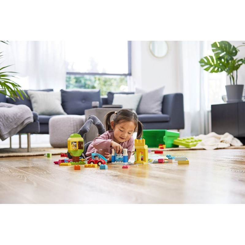 • Pestrou sadu kostek, dílků, čísel a postav pak můžete pohodlně uschovat do žlutého úložného boxu s víkem s 8 výstupky ve stylu LEGO® DUPLO®. Spojte ji s dalšími stavebnicemi DUPLO pro ještě více tvořivé zábavy.