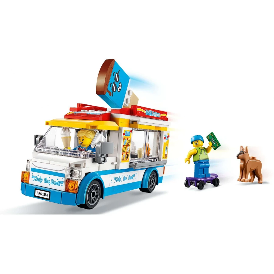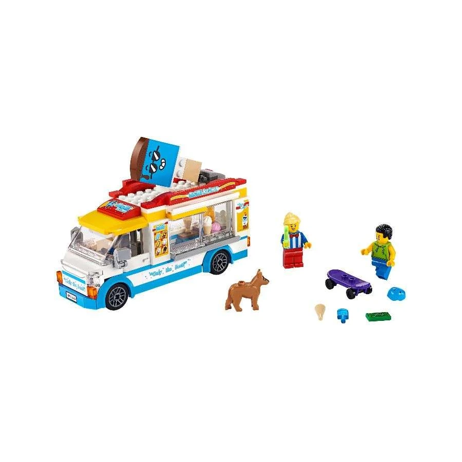 Cink cink! To je dobrota! Zmrzlinářské auto dorazilo do LEGO® City! Dejte si ještě jedno kolečko na vašem parádním skateboardu, poté otočte prkno, sundejte si helmu a vydejte se na něco dobrého spolu s vaším roztomilým psem. Pomozte zmrzlinářce vydávat lahodné zmrzlinové kornouty a nanuky. Pak zavřete výdejní okénko a pomozte tuto úžasnou, vícebarevnou dodávku dovézt na další zastávku!
