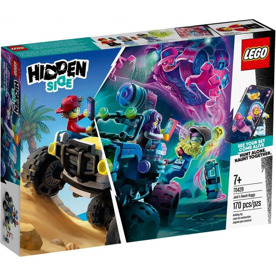 Dojeďte do světa Hidden Side na Jackově plážové bugině a vychutnejte si úžasný zážitek z rozšířené reality pro jednoho nebo více hráčů! Postavte cool buginu s minifigurkami Jacka, Parker a posedlého Scotta Francise s 2 hlavami. Pak si stáhněte bezplatnou aplikaci Hidden Side pro rozšířenou realitu, naskenujte váš model pomocí chytrého zařízení a odhalte strašidelný svět. Pusťte se do boje s duchy, hledejte stopy a porazte strašidelného bosse Truckera Dalea!