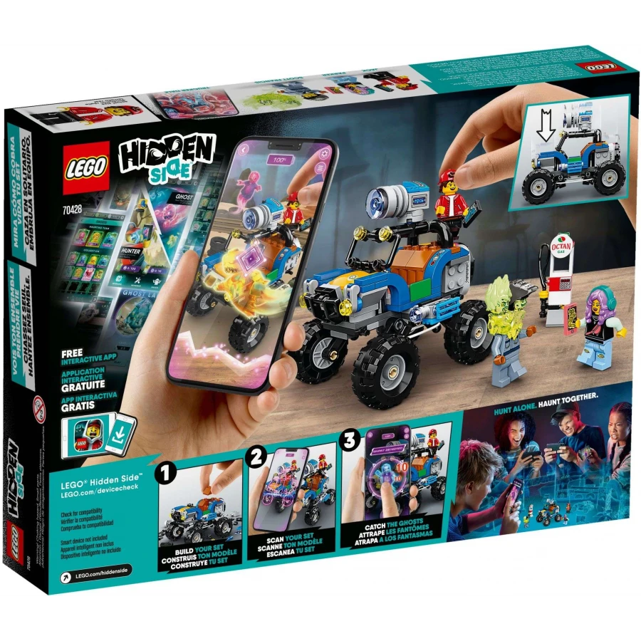 Malé děti si zamilují úžasný vesmír Hidden Side, v němž se prolíná fyzický svět s tím digitálním! Tato sada Jack a plážová bugina (70428) od LEGO® Hidden Side kombinuje sestavitelný LEGO model s aplikací nabízející herní zážitek ze smíšené reality pro jednoho nebo více hráčů, kde interakce s modelem vyvolává události v digitálním světě. Úžasná interaktivní LEGO stavebnice Když se na Jackovu plážovou buginu podíváte přes chytrý telefon nebo tablet vybavený aplikací LEGO Hidden Side pro rozšířenou realitu, odhalíte strašidelný digitální svět. Pak se děti vydají na průzkum, za záhadami a na lov duchů a utkají se s se strašidelným bossem Truckerem Dalem, ať už samy, nebo online s přáteli. A díky 3 minifigurkám nabízí sada prostor pro kreativní a zábavné hraní! O neustále se vyvíjející řadě Hidden Side Sady od LEGO Hidden Side obohacují LEGO modely o interaktivní hraní s rozšířenou realitou. Herní zážitek neustále zlepšujeme prostřednictvím nového obsahu, duchů a speciálních událostí. Jednoduše si do chytrého zařízení nainstalujte bezplatnou aplikaci Hidden Side pro rozšířenou realitu a naskenujte tento model!