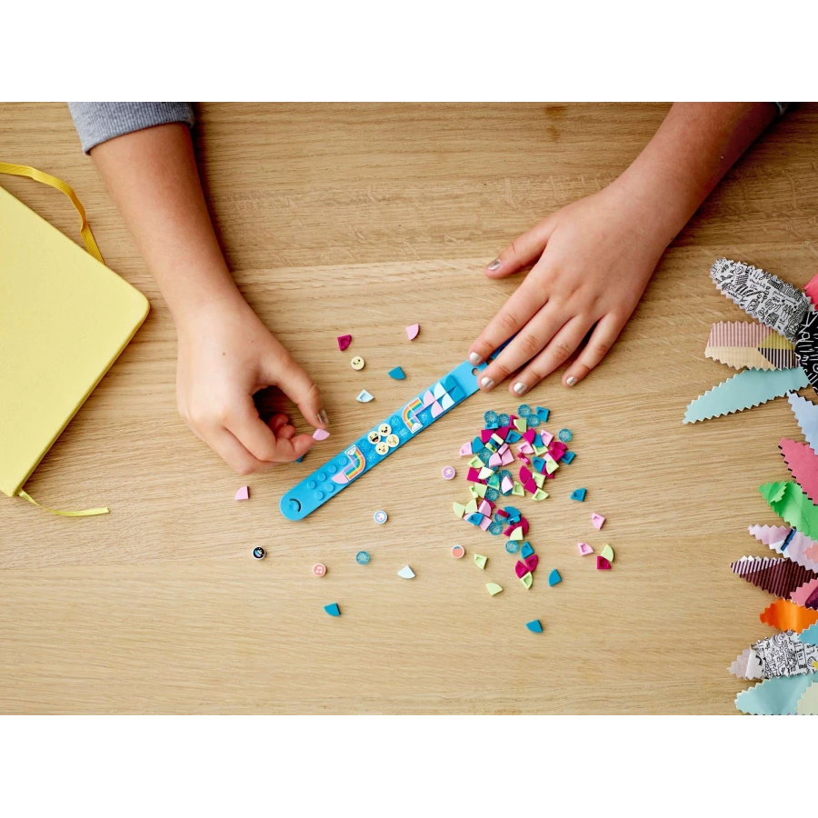 • Barevné dílky z této a jiných sad zaručí spoustu kreativní legrace. Děti mohou použít také dílky ze sady LEGO® DOTS™ doplňky – 1. série 41908, která jim poskytne nové ozdoby a ještě více možností, jak upravit svůj náramek.