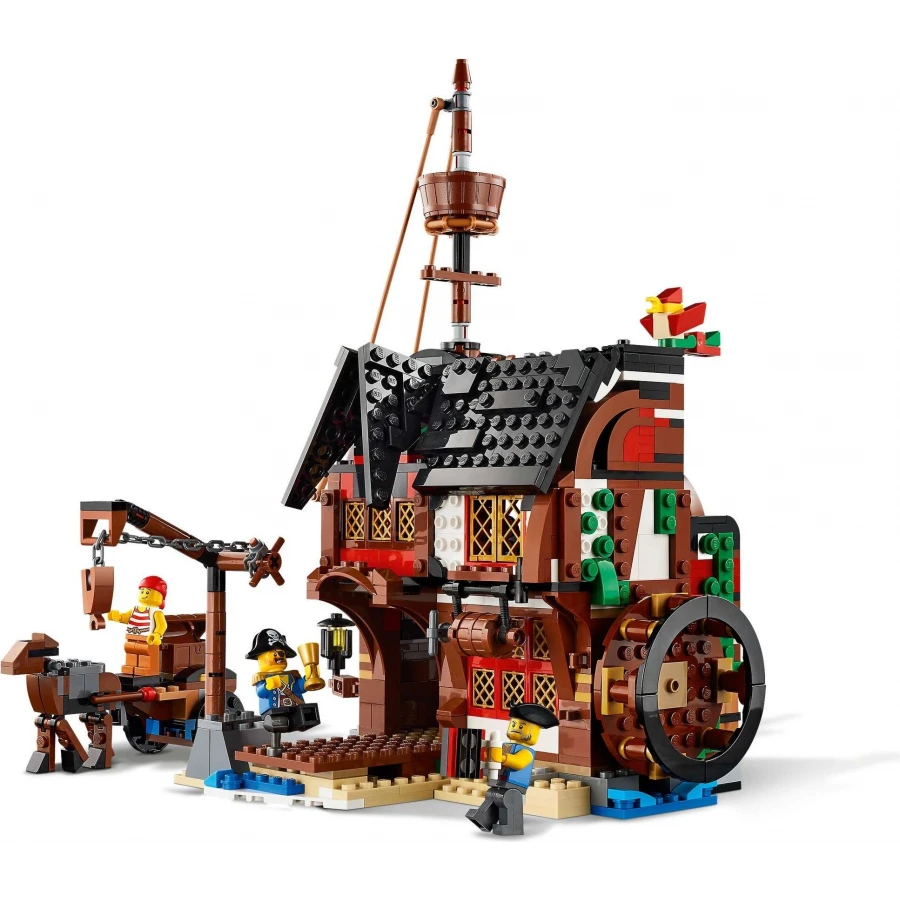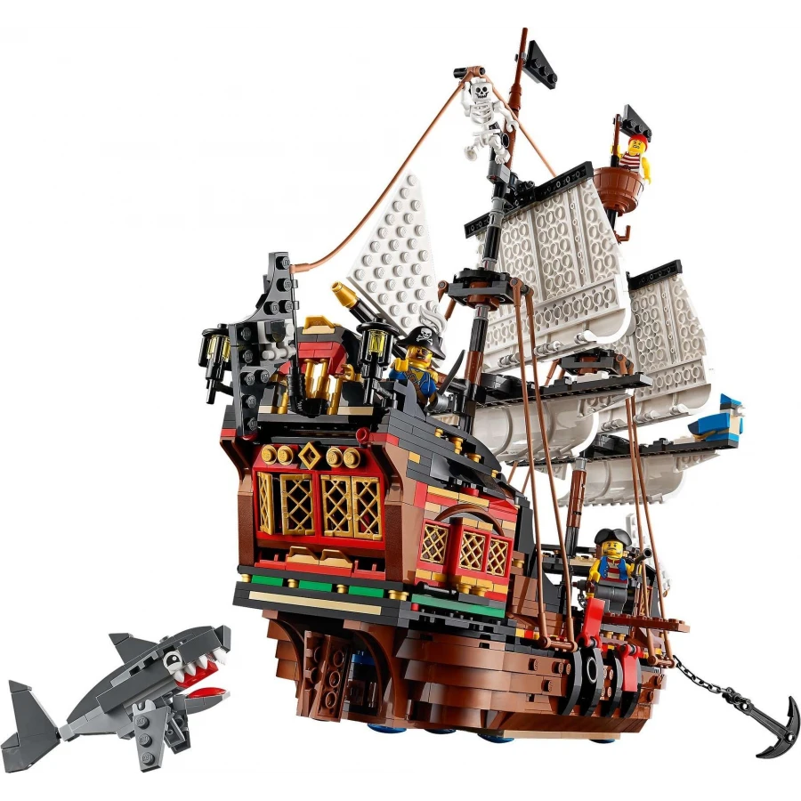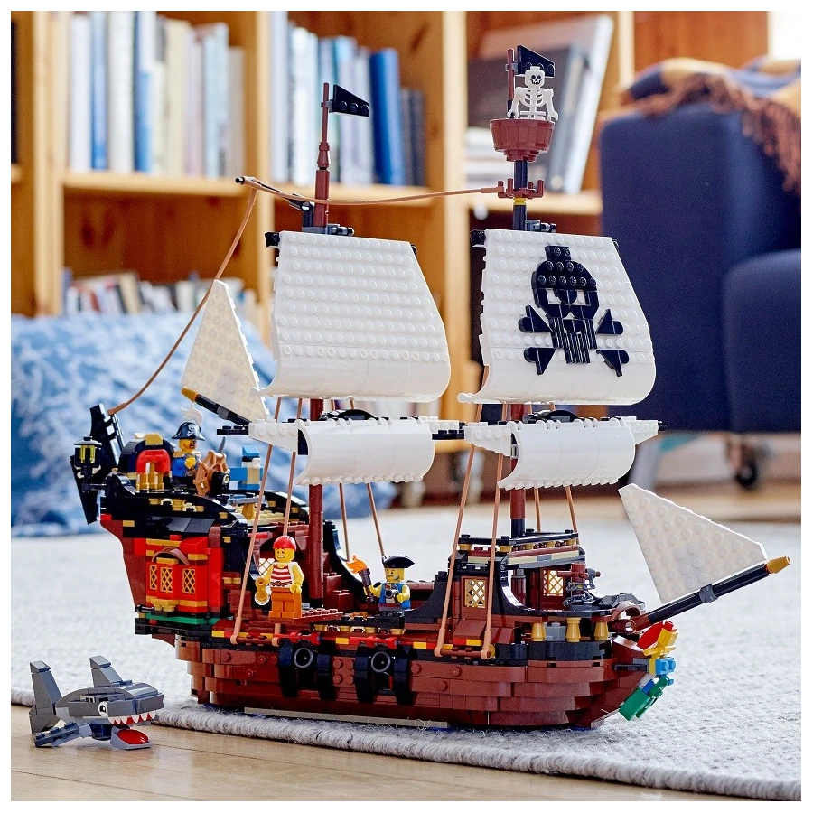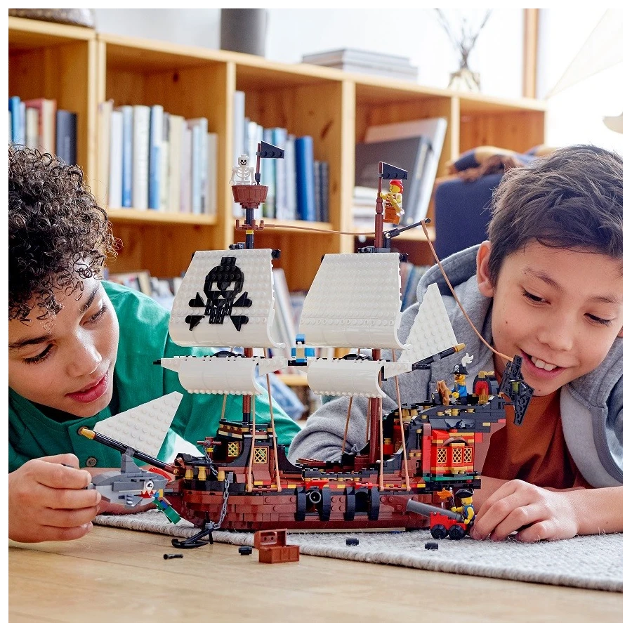 Arrrrrrr! Vytáhněte kotvu a napněte plachty na této úžasné pirátské lodi! Vyplujte na širé moře a zažijte nevšední dobrodružství. Loď na pravoboku! Kanóny do pozice a připravte se pálit: ta loď bude určitě plná kořisti! Jakmile vaše dobrodružství na moři skončí, přestavějte loď na pirátskou krčmu nebo ostrov lebek. Tato stavebnice 3 v 1 nedává nudě šanci!