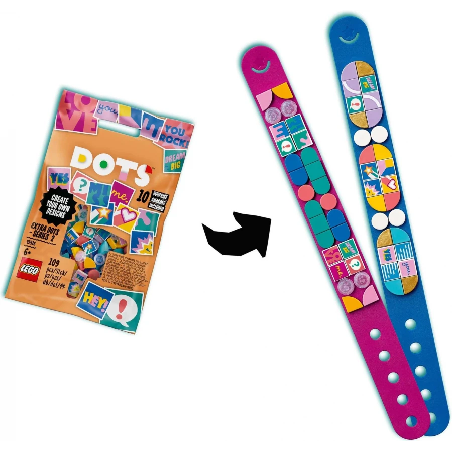 Děti a všichni umělci si parádní stavebnici LEGO® DOTS (41916) DOTS doplňky – 2. série doslova zamilují! Těmito jednoduchými doplňky lze obohatit všechny možné sady od LEGO DOTS, takže dětem dají možnost zábavně rozšířit své ozdoby nespočtem způsobů tak, aby ladily s jejich oblečením či pokojem nebo odpovídaly jejich náladě. Balíček plný kreativity Tato báječná sada obsahuje 109 barevných dílků, včetně 20 duhově třpytivých a 10 z celkem 16 speciálně potištěných zdobítek – nechte se proto překvapit tím, co na vás v balíčku čeká! Pomocí těchto doplňků si děti mohou vyzdobit vlastní náramky přátelství nebo si z nich vyrobit dekoraci do pokojíčku a zapojit přitom své kreativní dovednosti. Umění a ruční práce jsou nyní ještě zábavnější Tato malá stavebnice dá kreativitě dětí ještě větší prostor, protože si budou moci své výrobky LEGO DOTS vyzdobit tak, aby ladily s výtvory kamarádů a ukázaly všem jejich jedinečný styl. Tyto sady lze použít jako dárek k Vánocům, zábavné překvapení k narozeninám nebo jako skvělý doplněk k ostatním stavebnicím DOTS.