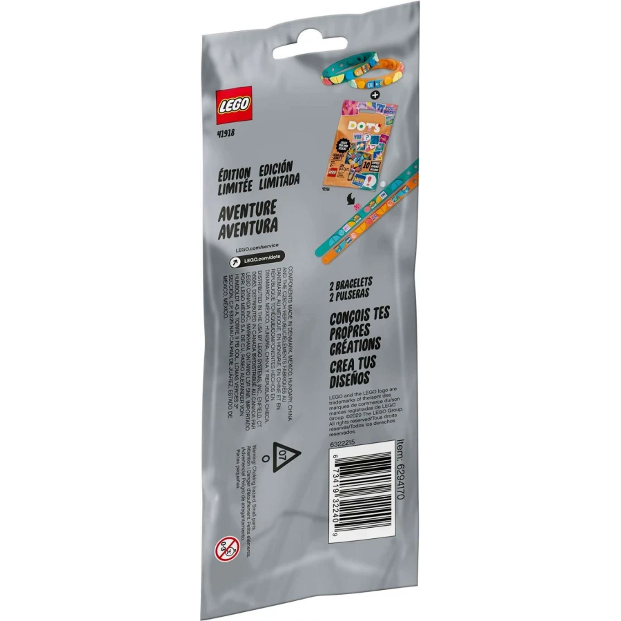 • Zaujměte malé návrháře zábavnou sadou na výrobu půvabných náramků přátelství Náramky dobrodružství (41918) od LEGO® DOTS z limitované edice, která obsahuje 2 nastavitelné náramky a 32 dílků. Stačí otevřít balíček a hraní může začít!