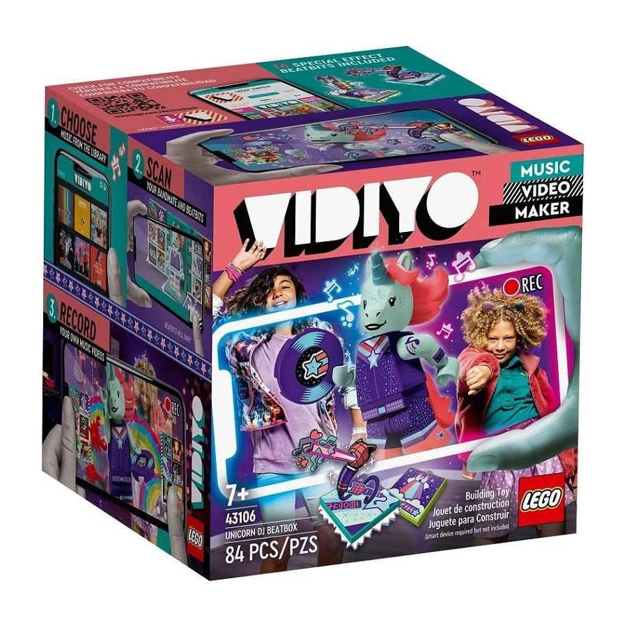 • Inspirujte děti k tvoření vlastních videoklipů se sadou LEGO® VIDIYO™ Unicorn DJ BeatBox (43106). BeatBox obsahuje minifigurku jednorožce s DJským vybavením a 16 BeatBitů – 14 náhodných a 2 jedinečné pro danou postavu.