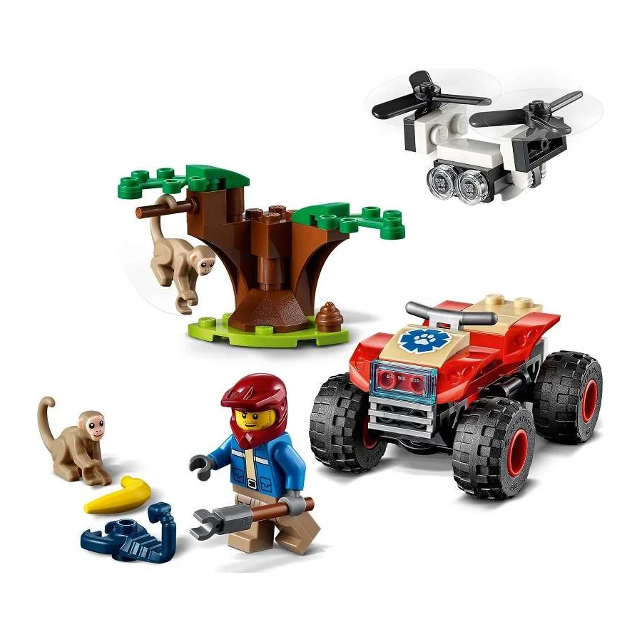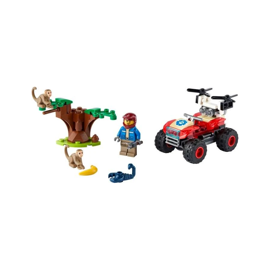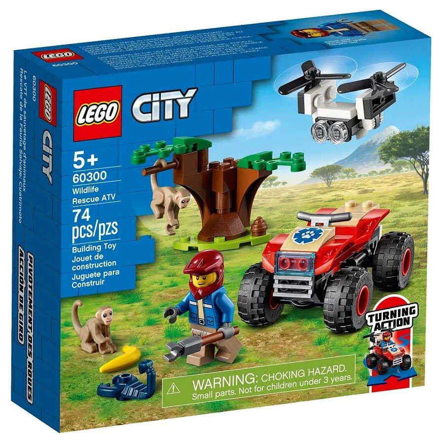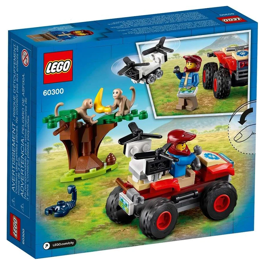 Vydej se za zábavným dobrodružstvím na savanu s LEGO® City. Připoj se k průzkumníkovi na jeho parádní čtyřkolce. Vzlétni s průzkumným dronem, který ti pomůže probádat život v divočině. Jejda! Hravé opice si našly nového kamaráda – černého škorpiona. To není dobrý nápad! Popadni uchopovač a spěchej na místo zachránit situaci. Až jejich parťáka opatrně přeneseš, zkontroluj, zda jsou opice v pořádku, a vrať se domů.