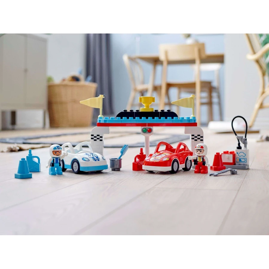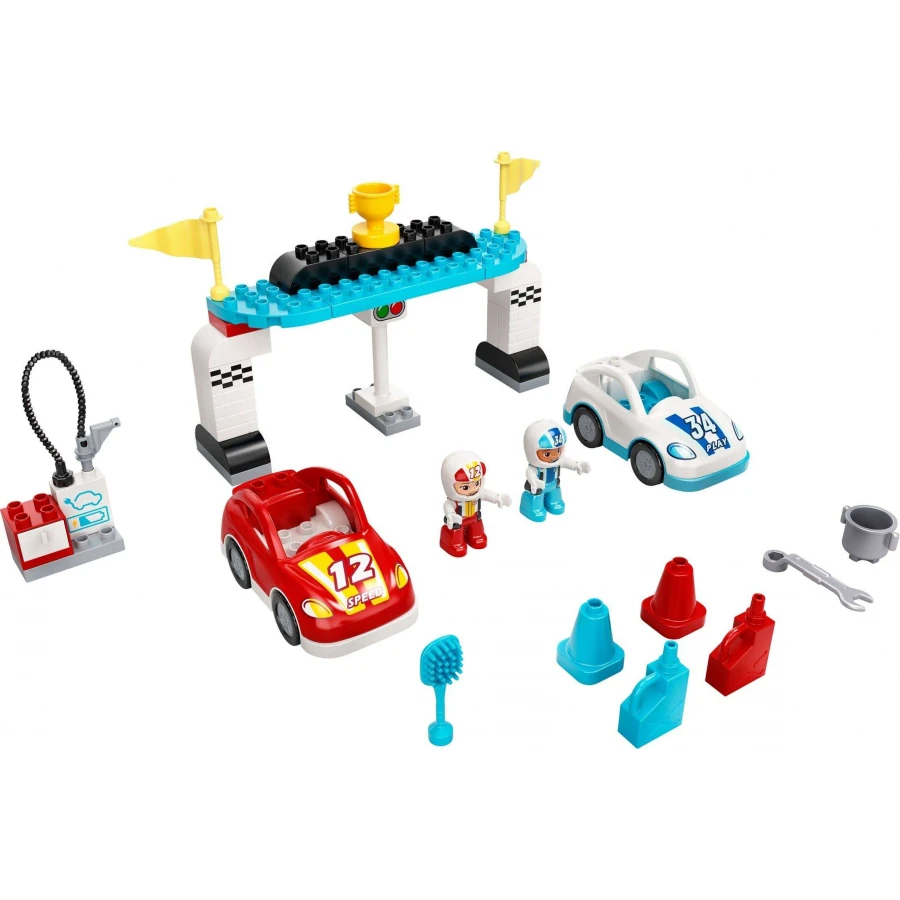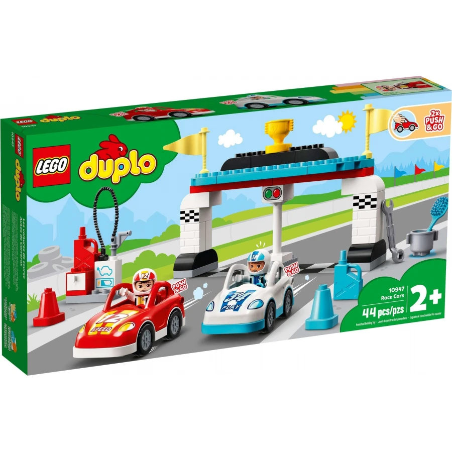 • Součástí stavebnice jsou DUPLO® figurky závodníka a závodnice s helmami, 2 auta s technologií Push-and-Go a doplňky, včetně trofeje, vlajek, nabíjecí stanice, kuželů a výbavy pro údržbu aut.