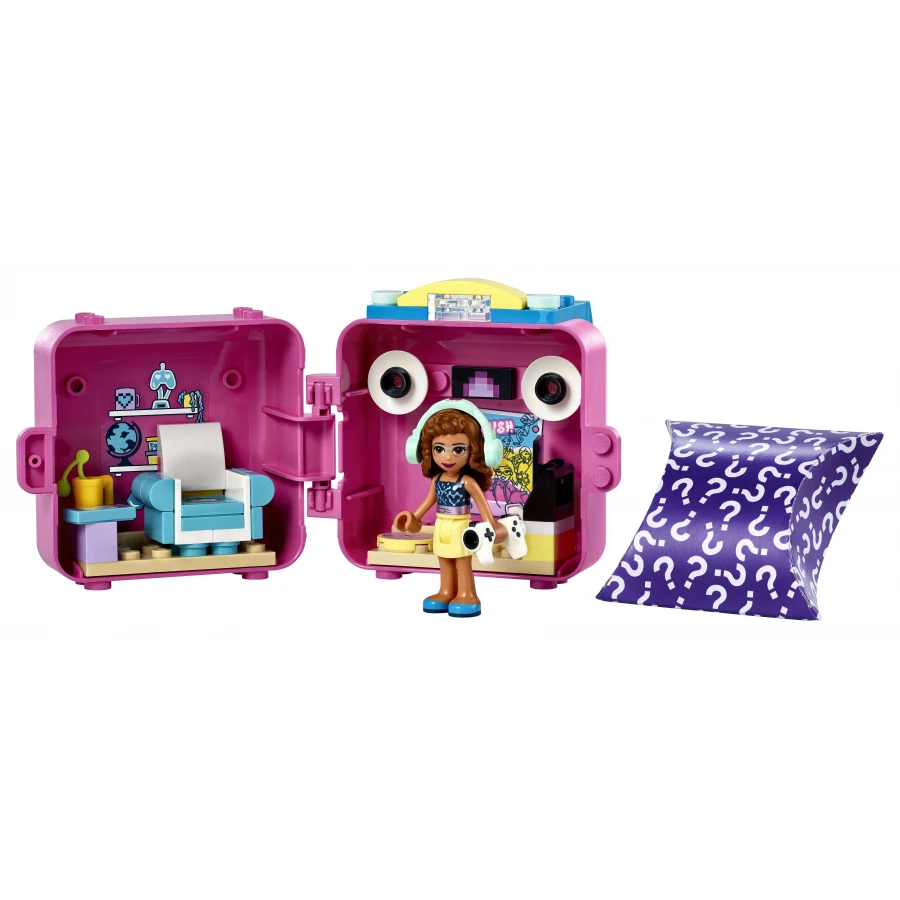 • Herní boxík obsahuje LEGO® Friends minipanenku Olivii, kočičí figurku v jedné ze čtyř barev, pohodlné křeslo, reproduktory, sluchátka, televizi a hrníček.