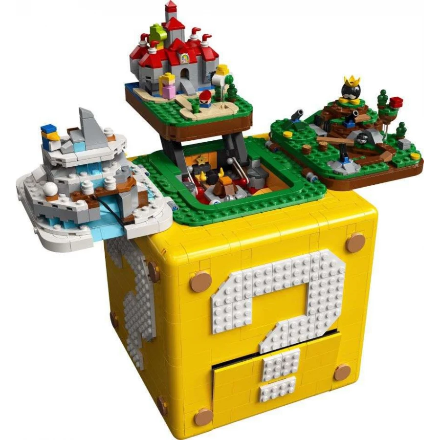 • Model akční kostky s otazníkem měří přes 18 cm na výšku, šířku a do hloubky a ukrývá 4 detailní úrovně ze hry Super Mario 64™: Peach’s Castle, Bob-omb Battlefield, Cool, Cool Mountain a Lethal Lava Trouble.