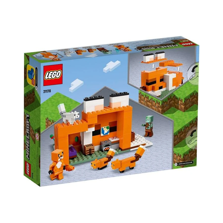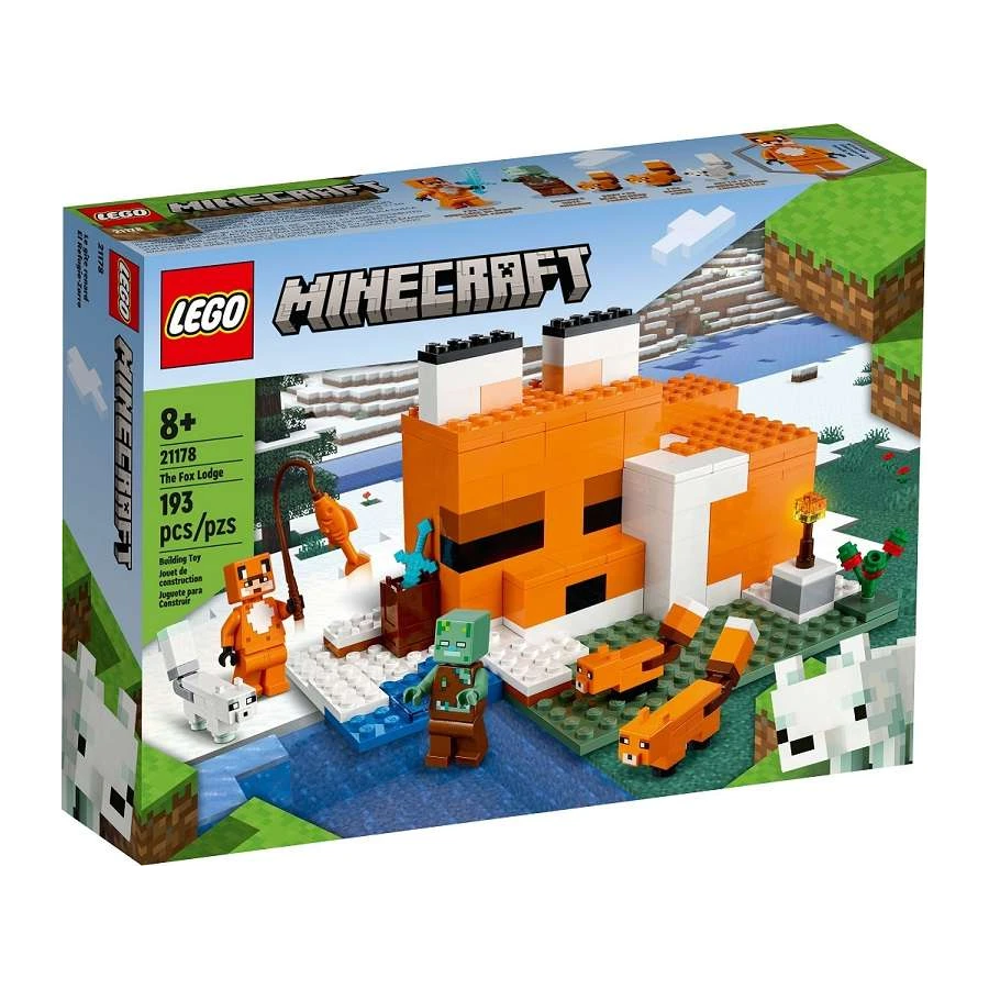 Díky široké řadě cool postav, autentických doplňků a neomezených herních možností je stavebnice Liščí domek (21178) od LEGO® Minecraft® ideálním dárkem pro děti od 8 let. Rušný den v liščím domku Děti mají možnost uplatnit své dovednosti ze světa Minecraft a postavit si domek ve tvaru spící lišky. Díky otevřené zadní straně a odnímatelné střeše lze velmi snadno uspořádat nábytek a hrát si ve vnitřním prostoru. Venku čeká liščí mládě, dospělá liška a polární liška, které děti mohou nakrmit lesními plody, než se zvířecí kamarádi uloží ke spánku. Zombie utopenec, oblíbená postava ze hry, způsobí pozdvižení. Děti se před ním musí ubránit mečem, aby zbraň následně mohly vyměnit za rybářský prut a nachytat si pár kousků.