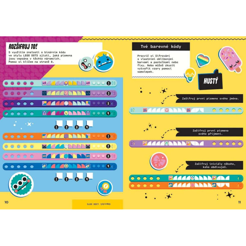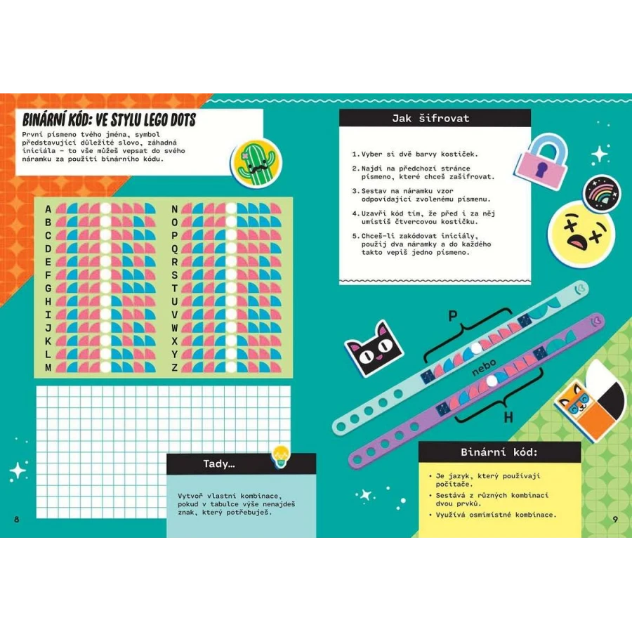 Gratulujeme! Ve tvém vlastnictví se právě ocitla super tajná knížka z řady LEGO® DOTS! Najdeš v ní dva náramky, samolepky, místo pro své zápisky i krabičky, které si můžeš vystřihnout a poskládat. A navíc objevíš vše, co potřebuješ k vytvoření psaných, kreslených nebo samolepkových šifer, jež pak můžeš poslat svým kamarádům!