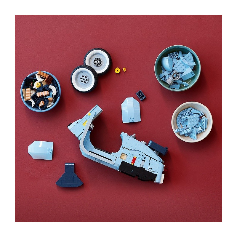 • Netradiční barevné provedení – model zdobí pastelově modrá, jedna z původních originálních barev skútru Vespa a zároveň ojedinělá barva pro kostky LEGO®