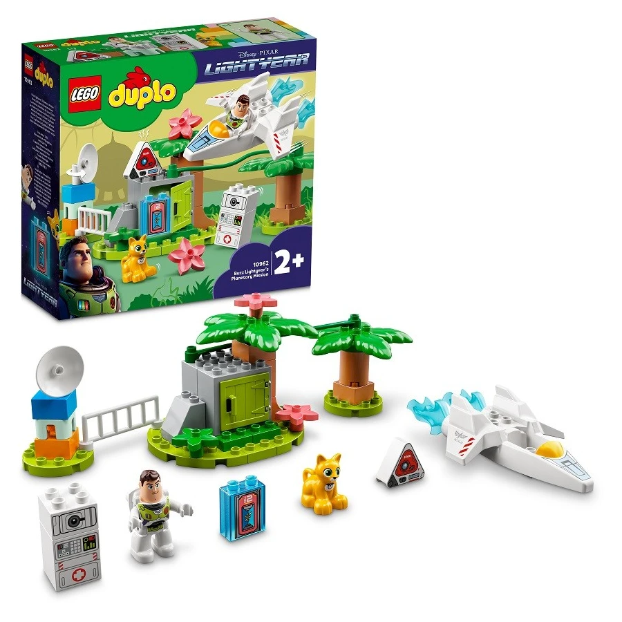 • Planeta, na které není nouze o akci – stavebnice obsahuje figurku LEGO® DUPLO® Buzze Rakeťáka, robokocoura Soxe, počítač jménem Ivan, trojúhelníkového droida Erica, vesmírnou loď, fantastické lokace a zábavné doplňky