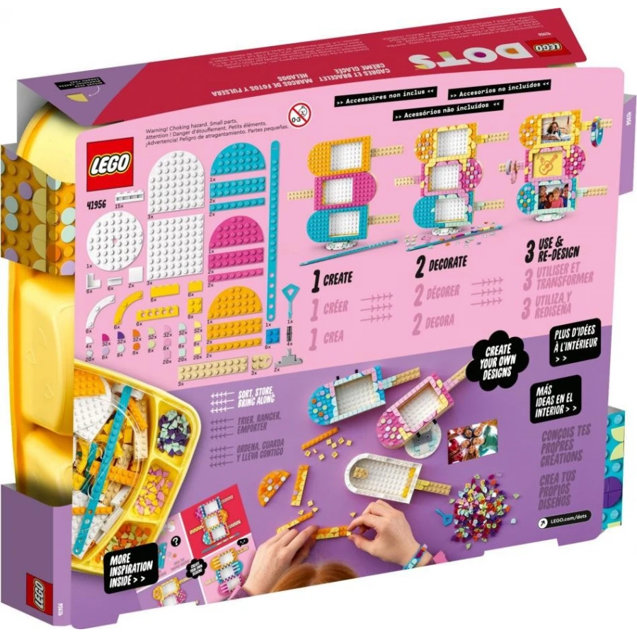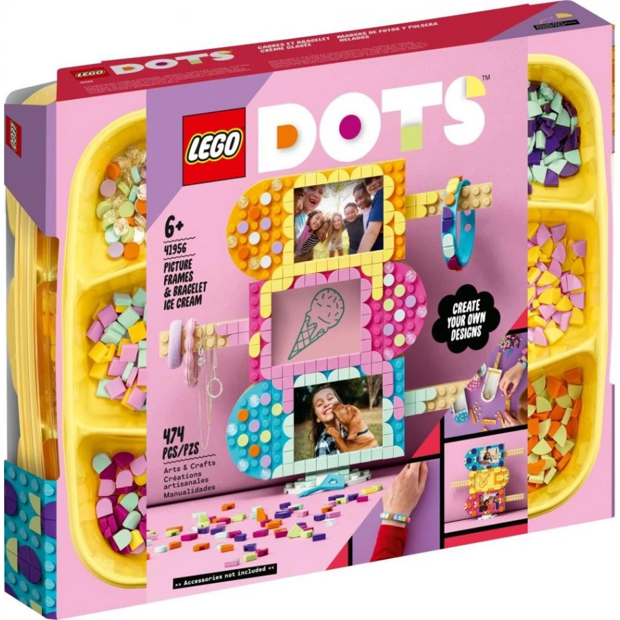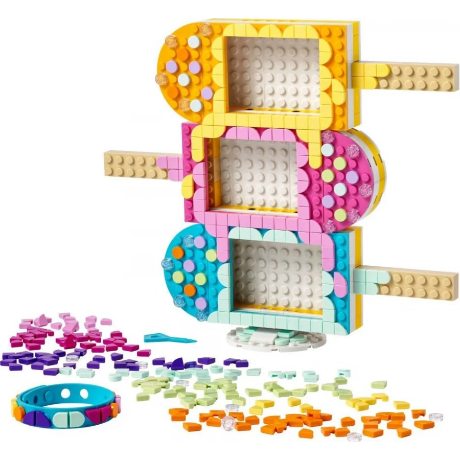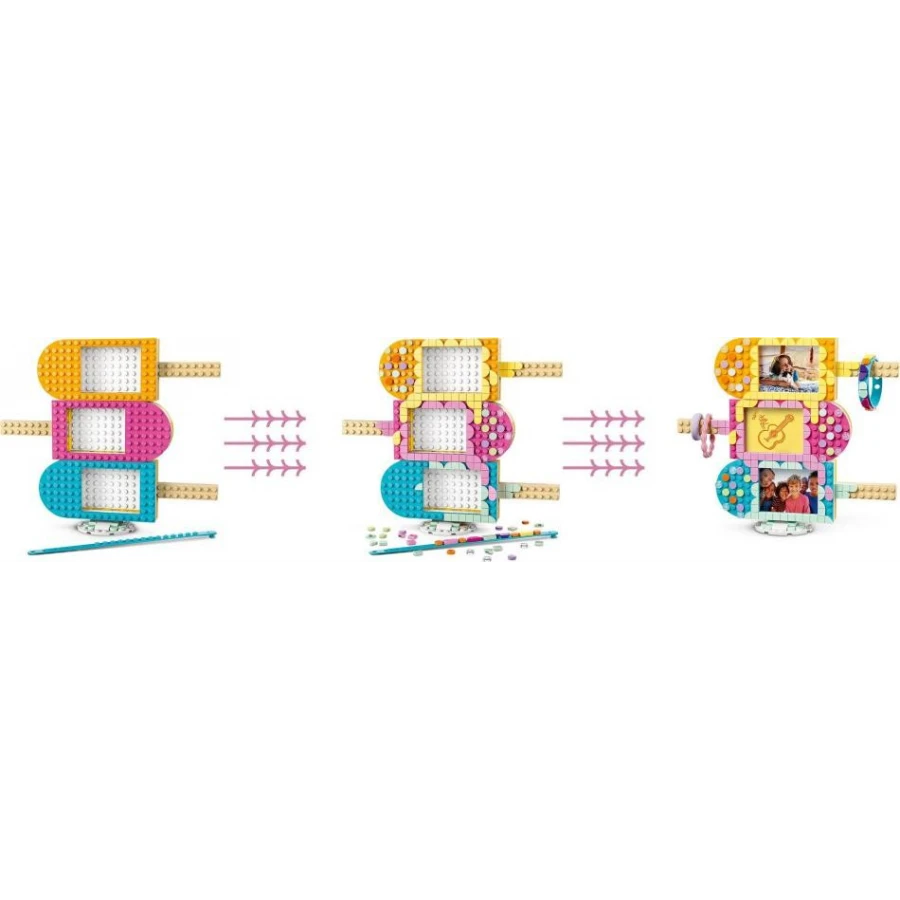 Připravte se na lahodnou zábavu ve stylu LEGO® DOTS! Sestavte si rámečky na fotografie v podobě nanuků a zkrášlete je svěžími, barevnými zdobítky. Rozložte tenký náramek a postup opakujte. Rámečky na sebe můžete naskládat v libovolném pořadí. Pak do nich vložte své oblíbené fotografie a zavěste na tyčky náramek a ostatní šperky. Jste připraveni na změnu? Rámečky a náramek si můžete kdykoli přetvořit! #ukazSVUJstyl