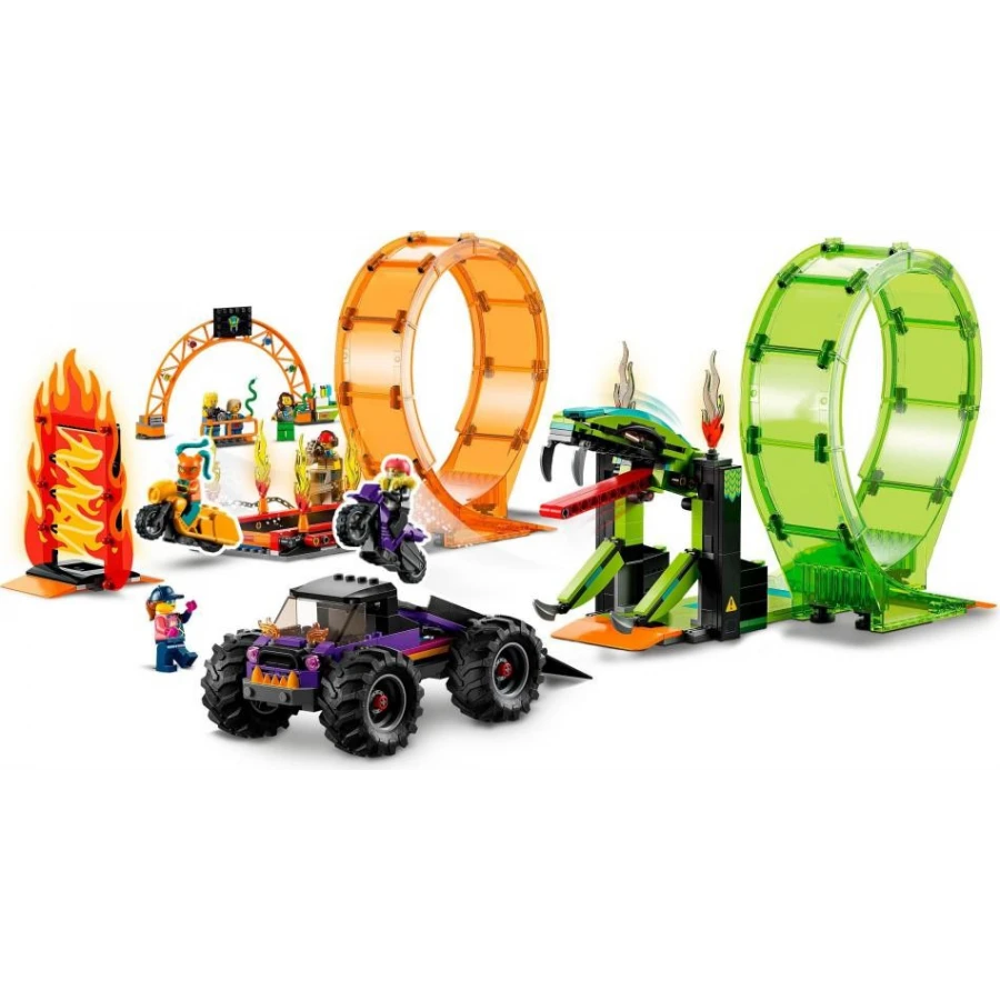 Vstupte do kaskadérské arény se dvěma smyčkami a vychutnejte si velkolepou kaskadérskou show! Nastartujte motorku se setrvačníkem a vydejte se směrem k rampě v takové rychlosti, abyste přeskočili monster truck a překonali ohnivou zeď! Proleťte smyčkou a vyjeďte z hadí tlamy stylově po zadním kole! Popřete gravitaci a zažehněte ohnivé kolo. LEGO® City je místem, které nabízí pořádnou dávku zaručeně strhující kaskadérské akce.