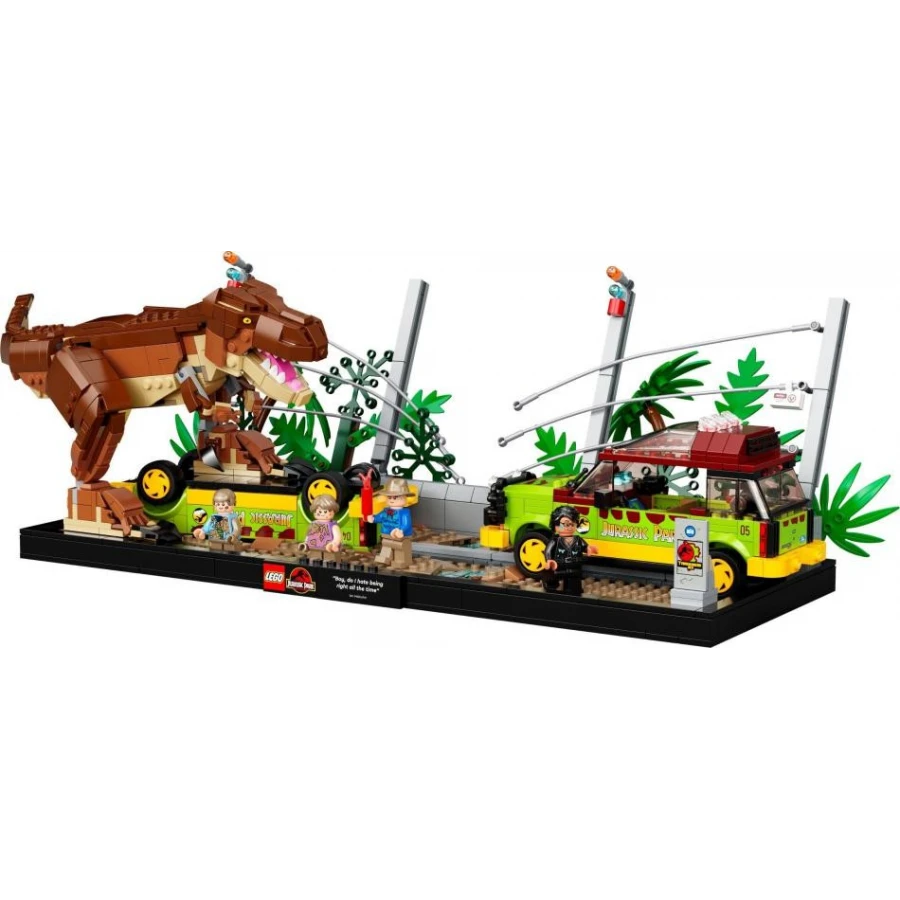 Sestavte si kostku po kostce klasickou scénu z filmu Jurský park s T-rexem, jak drtí převrácený Ford Explorer, druhým identickým vozem a zničeným elektrickým ohradníkem. Tento výstavní model s minifigurkami Alana Granta, Iana Malcolma a Tima a Lex Murphyových doslova překypuje autentickými detaily – nechybí sestavitelné brýle pro noční vidění nebo dílek světlice. Takže popadněte mísu popcornu a pusťte se do stavění!