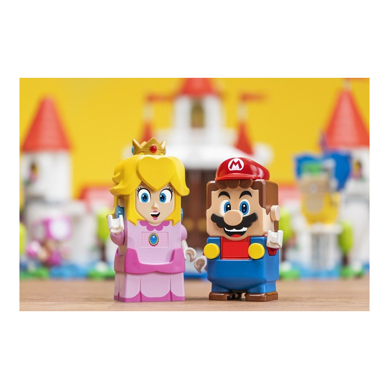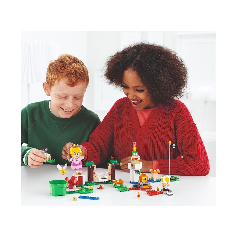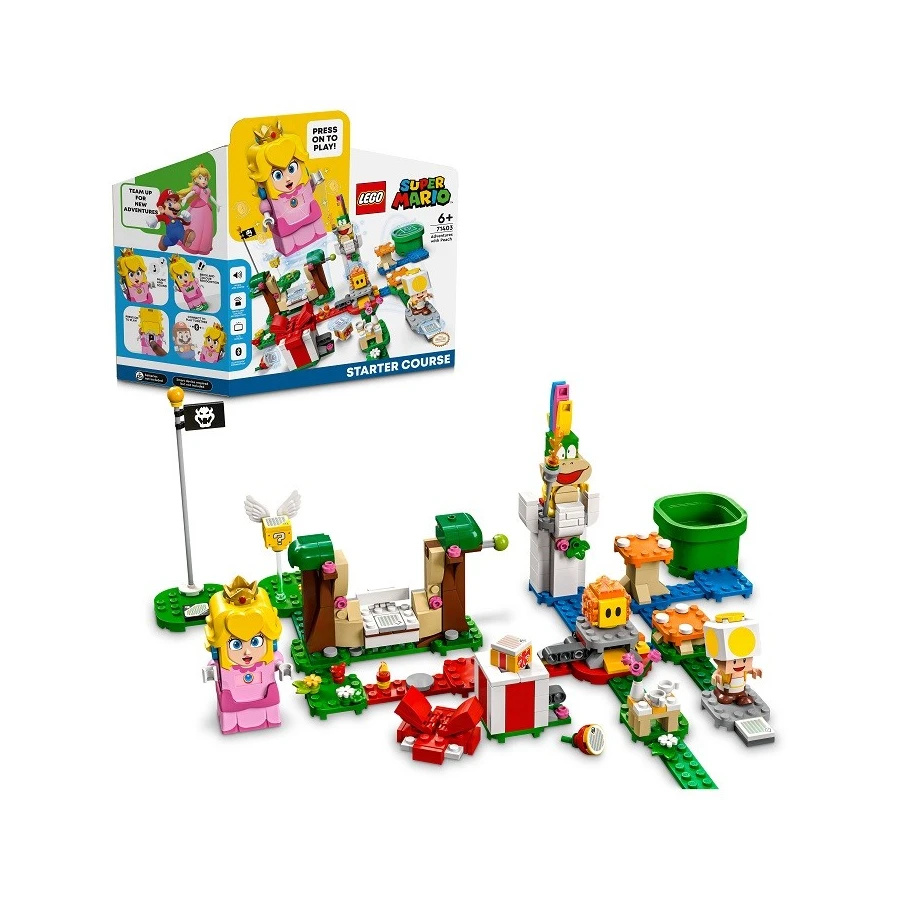 Darujte dětem vstupenku do interaktivního světa LEGO® Super Mario™ ve formě startovacího setu Dobrodružství s Peach (71403). Set obsahuje figurku LEGO® Peach™ s funkcí okamžité reakce prostřednictvím LCD obrazovky a reproduktoru. LEGO Peach může utvořit tým s LEGO® Mariem nebo LEGO® Luigim (tyto další figurky nejsou součástí balení) prostřednictvím Bluetooth a sbírat společně bonusové mince za týmovou práci. Šťavnatá zábava Překonávejte překážky, rozdávejte radost a vyšlete do akce Lava Bubble, aby svrhla Lemmyho z věže. Sbírejte s LEGO Peach digitální mince za procházení úrovní a interakci se žlutým Toadem. Odměny ukrývá i létající akční kostka s otazníkem. LEGO Peach si dokonce může pochutnat na červeném ovoci, díky čemuž bude šťastnější a získá mince navíc. Zároveň je možné šťavnatou svačinku darovat žlutému Toadovi nebo jiné interaktivní figurce (není součástí balení). Návod na stavění najdete v aplikaci LEGO Super Mario. Neomezená kreativita Sběratelské startovací a rozšiřující sety LEGO Super Mario umožňují fanouškům tvořit, rozšiřovat a přestavovat jedinečné herní úrovně.