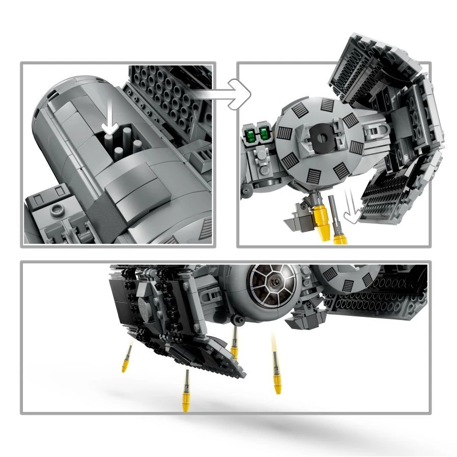 • Sestaven pro boj – Bombardér TIE je vybaven otevíracím kokpitem pro minifigurku, přihrádkou pro 4 torpéda (stavebnice obsahuje 6 sestavitelných torpéd), která lze shodit, a 2 vystřelovači