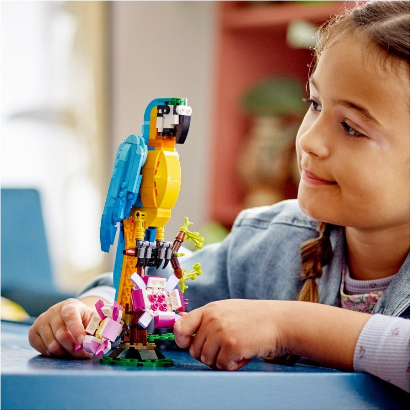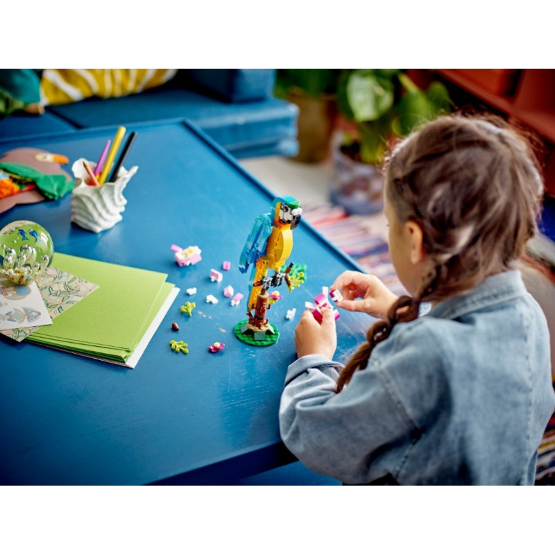 Se stavebnicí Exotický papoušek (31136) od LEGO® Creator 3 v 1 se malí stavitelé a milovníci zvířat od 7 let vypraví do pralesa, kde zažijí akční dobrodružství. Mohou se těšit na pestrobarevného papouška, který sedí na větvi, kde se otáčí a hýbe křídly a ocasem. Nastartujte kreativní zábavu 3 v 1 S touto stavebnicí LEGO 3 v 1 budou mít děti příležitost postavit si 3 různá exotická zvířata. Mohou si poskládat barevného papouška na větvi stromu a přestavět ho na hravou rybu plavající v moři nebo na zábavnou žábu, která umí hýbat nohama. Zábavný digitální zážitek pro fanoušky LEGO® Stáhněte si aplikaci s návody LEGO Builder, která dětem umožní vychutnat si zcela novou porci zábavy při stavění díky funkcím přibližování a otáčení modelů ve 3D, ukládání stavebnic a sledování postupu.