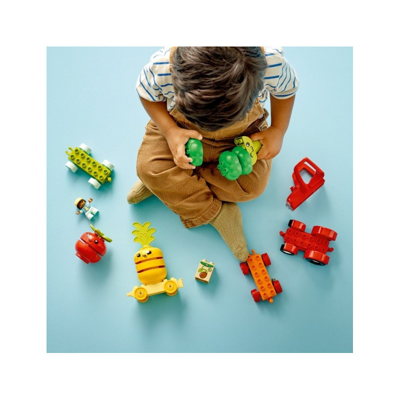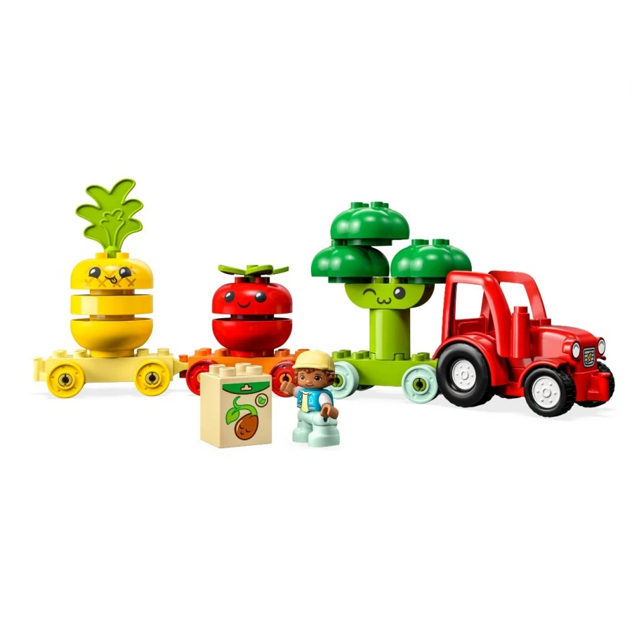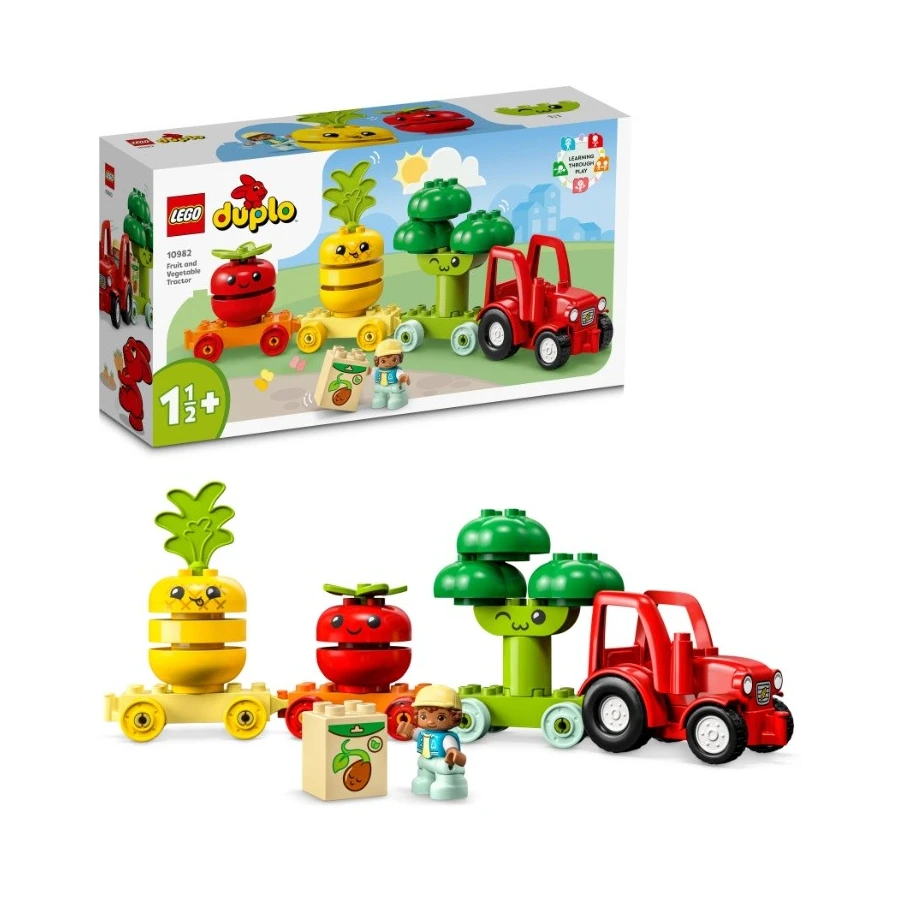 Stavebnice LEGO® DUPLO® Můj první traktor se zeleninou a ovocem (10982) přináší těm nejmenším spoustu způsobů, jak se učit. Děti budou pomáhat farmáři sklízet plodiny s traktorem se 3 přívěsy. Děti od 18 měsíců zdokonalí své motorické dovednosti a zjistí, jak se pěstuje zelenina a ovoce. Při skládáním kostek na sebe si mohou hrát na to, že plodiny „rostou“. Také si užijí zábavu při třídění podle barev, protože budou dávat rostliny do správných přívěsů. Malé děti však mohou zapojit i svou kreativitu a schopnost sebevyjádření, aby pomíchaly barvy podle sebe nebo změnily obličeje, jak se jim zlíbí! Vzdělávací hračky, díky kterým je učení zábava Všechny hračky LEGO DUPLO jsou odborně navržené tak, aby přinášely zábavné příběhy, pestré barvy, zajímavé postavy a spoustu detailů, které podnítí rozvoj dovedností malých stavitelů. Tento model je kompatibilní s dalšími stavebnicemi z řady Moje první na motivy farmaření a se všemi modely LEGO DUPLO.