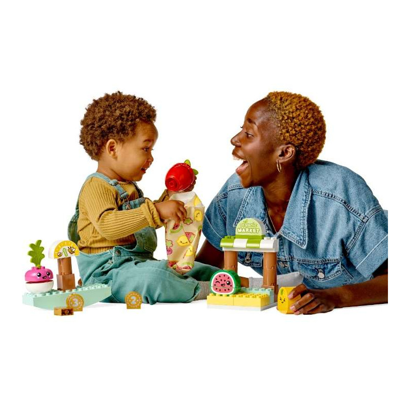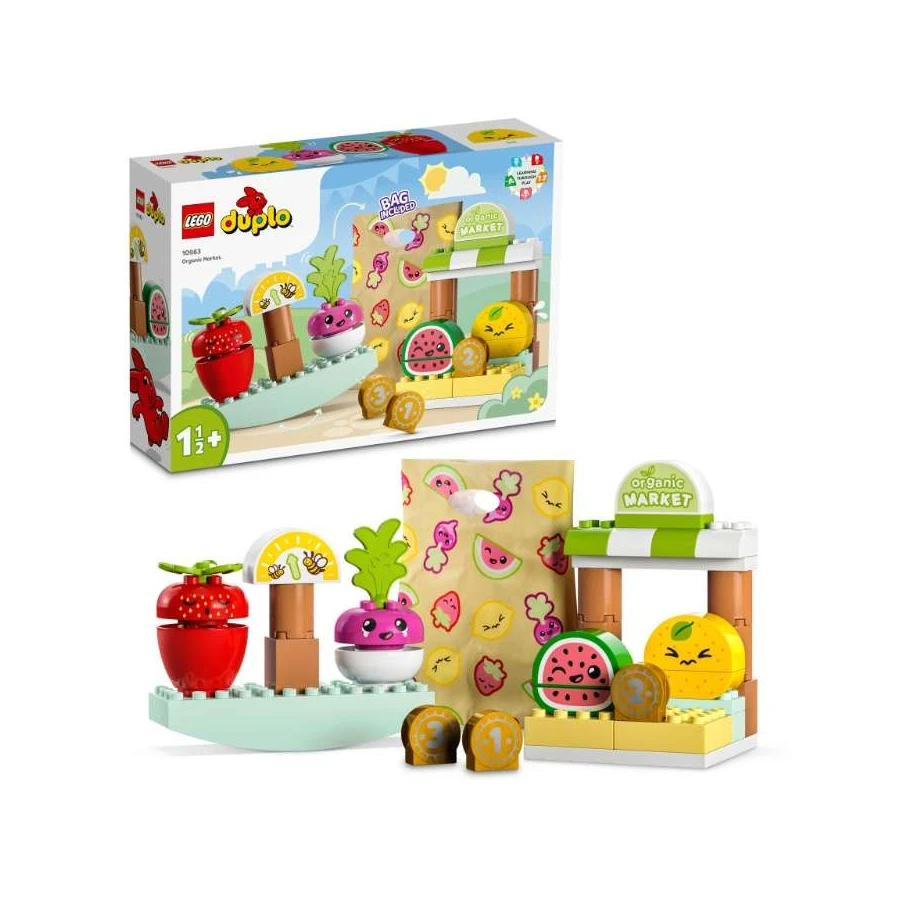 Zahrajte si s dětmi na obchod se stavebnicí LEGO® DUPLO® Můj první bio farmářský trh (10983). Tento roztomilý farmářský trh dětem umožní hrát si na opravdový svět. Budou vážit potraviny, platit mincemi různých hodnot a nosit jídlo domů v rozkošné látkové tašce. Edukační hračky, se kterými je legrace Děti se budou učit vyvažovat kostky, zatímco budou na sebe skládat ředkvičku, jahody, citron a meloun. Všechny stavebnice LEGO DUPLO jsou navržené tak, aby rozvíjely schopnost sebevyjádření. V této stavebnici mají všechny dílky svůj výraz, který zažehne jiskru představivosti a zajistí zábavné hraní! Tvořivá vzdělávací stavebnice pro nejmenší Hračky LEGO DUPLO dávají těm nejmenším možnost zažít neomezené tvoření, sebevyjádření a zábavné učení. Tato stavebnice inspiruje děti a dospělé k společnému interaktivnímu hraní, ve kterém se z jednoho stane stánkař s ovocem a zeleninou a z druhého zákazník. Stavebnice DUPLO umožní rodičům a malým dětem sdílet vzácné vývojové milníky, zatímco si spolu hrají a staví.