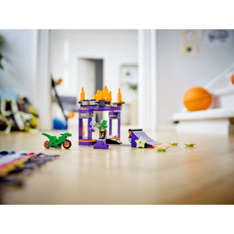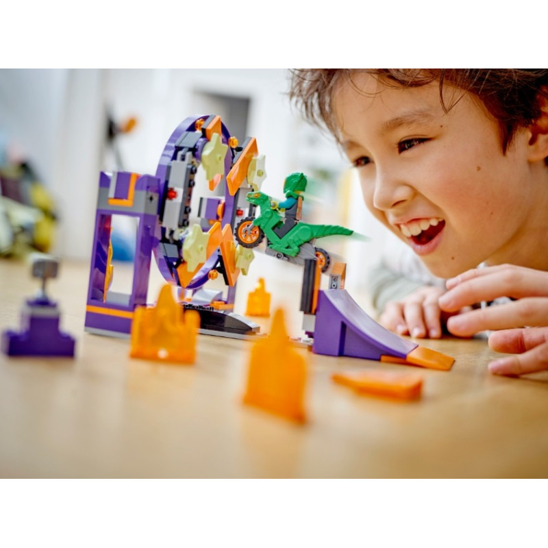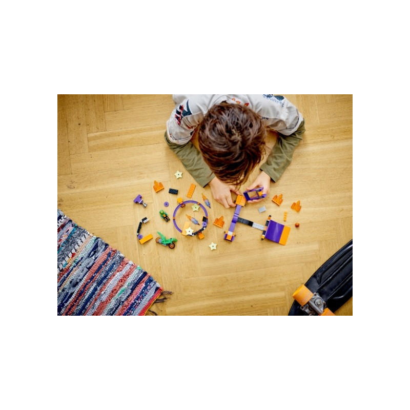 • Co vás čeká v krabici? – Tato stavebnice obsahuje LEGO® City Stuntz vodorovně nebo svisle sestavitelnou smyčku, startovací rampu, kaskadérskou motorku se setrvačníkem a minifigurku jezdce
