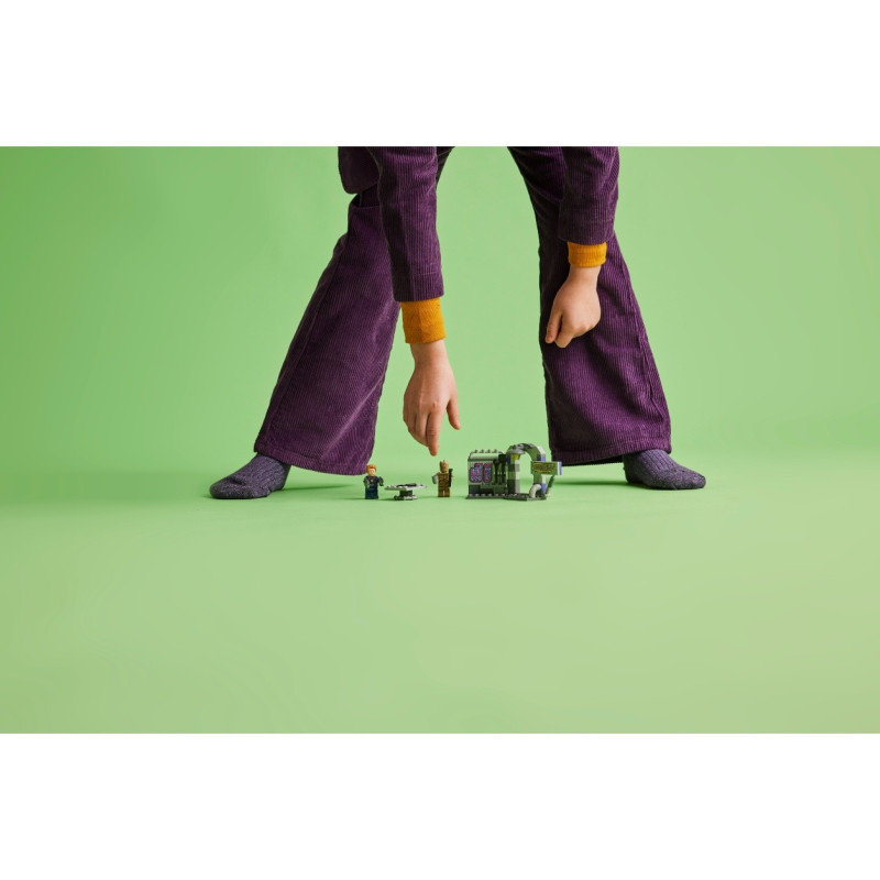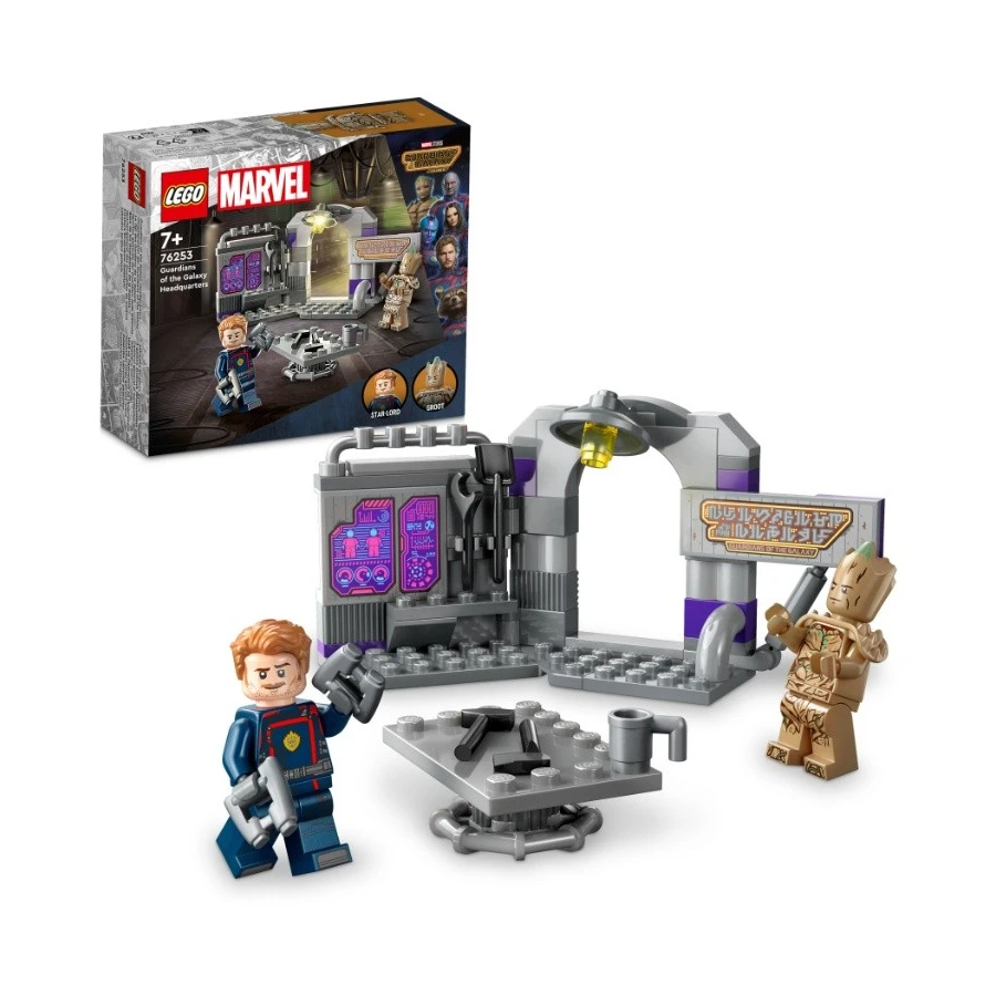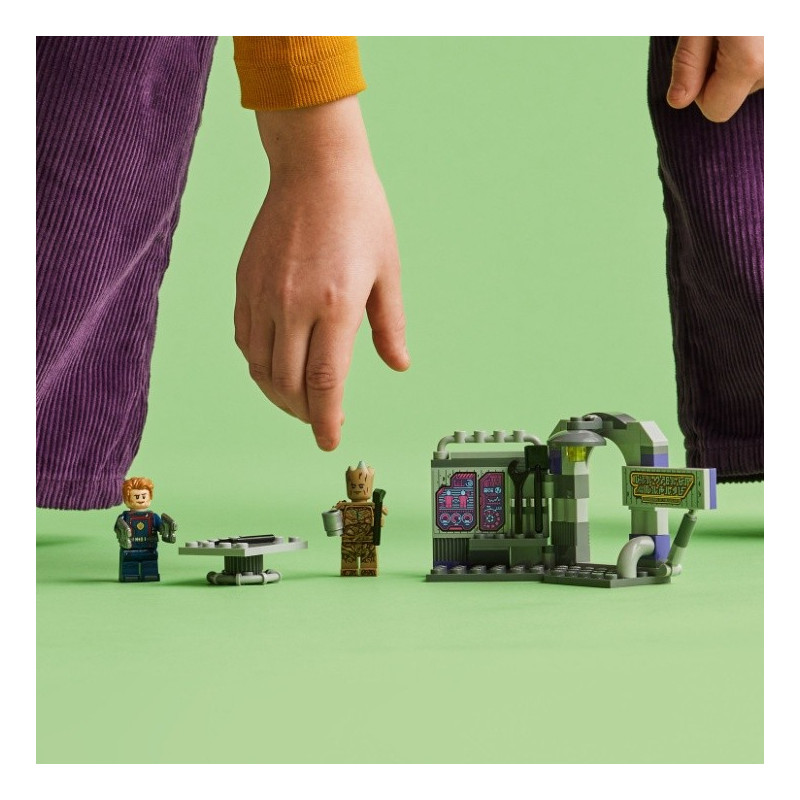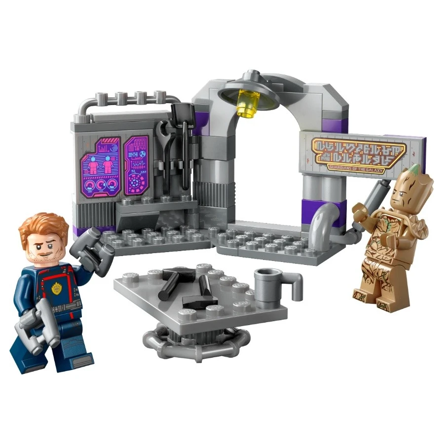 • Známé postavy – Součástí jsou 2 kultovní minifigurky, Groot a Star-Lord, včetně sestavitelné základny s nástroji, technologiemi a stolem