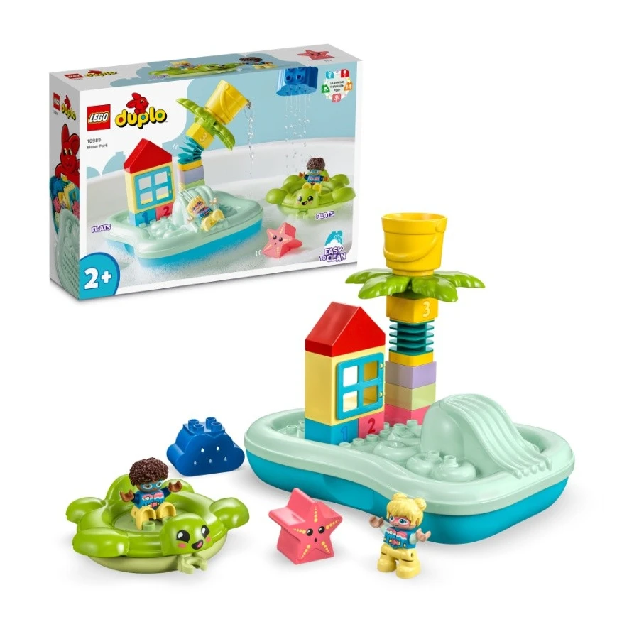 Hledáte tu nejlepší hračku do koupele pro malé děti od 2 let? Hračka LEGO® DUPLO® Město 10989 Aquapark promění koupání na zábavné učení, kdy děti prozkoumávají tento barevný aquapark. Současně seznamuje malé plaváčky s čísly a rozvíjí jejich schopnost nalévat vodu. Tuto stavebnici také snadno očistíte a uložíte. Interaktivní hračka pro nápadité hraní Tato vzdělávací hračka obsahuje ohýbací palmu, kterou mohou děti nechat růst pomocí kostek s čísly 1-2-3. Děti naplní kyblík na stromě vodou a pocákají figurku dítěte. Můžou figurku nechat sklouznout po vodní skluzavce a vylétnout až na nafukovací želvičku. Po naplnění mráčku vodou děti spustí déšť na všechny zábavné prvky. Praktický design, který si rodiče zamilují Hračky do koupele LEGO DUPLO jsou navrženy tak, aby se mohli rodiče spolu s dětmi vydat na cestu radostným objevováním. A po koupání mohou dospělí tento plovoucí kruh otevřít a snadno osušit, aby hračka zůstala hygienicky čistá.