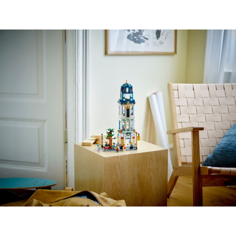 Připravte se na zábavný výlet do rušného města! Ubytujte se v hotelu, procházejte desky v obchodě s hudbou, dejte si svačinu v kavárně a užijte si hudbu kapely hrající na střeše. Stavebnici poté přestavějte na stylový 4patrový secesní mrakodrap se vstupní halou, kuchyní, obývákem a kanceláří, nebo na ulici s bránou na trh, s fotoateliérem a květinářstvím. S touto stavebnicí 3 v 1 hraní nikdy neskončí!