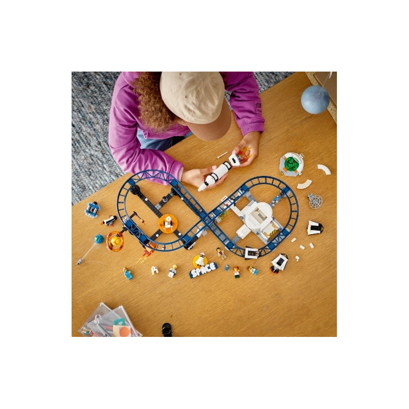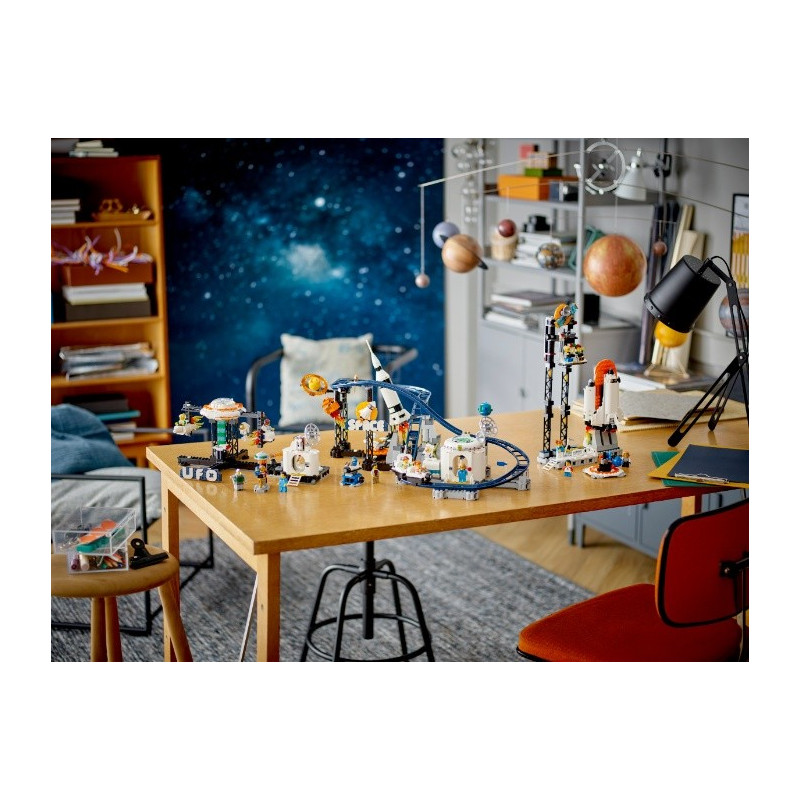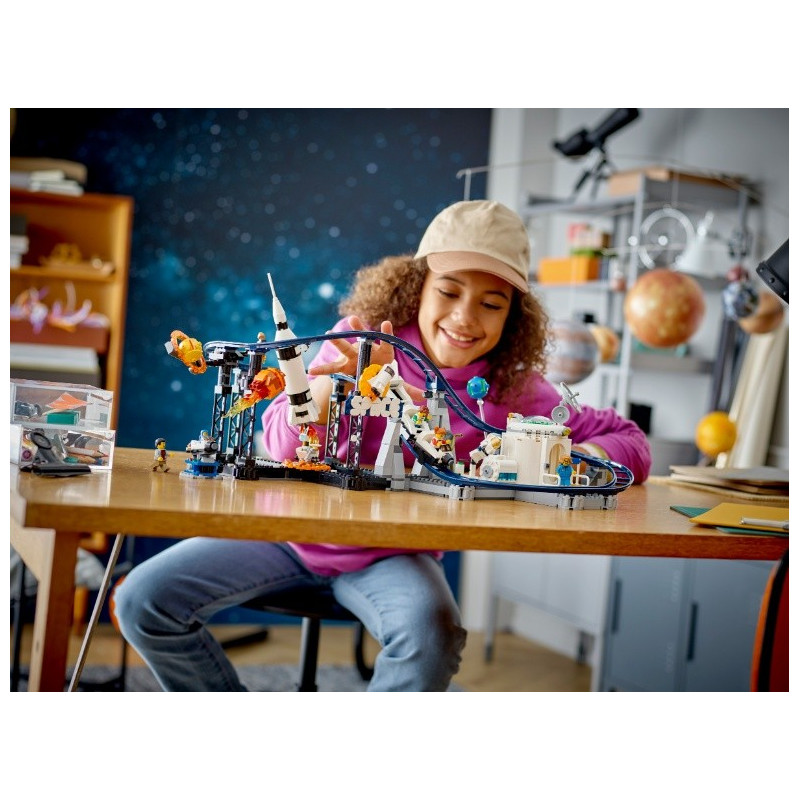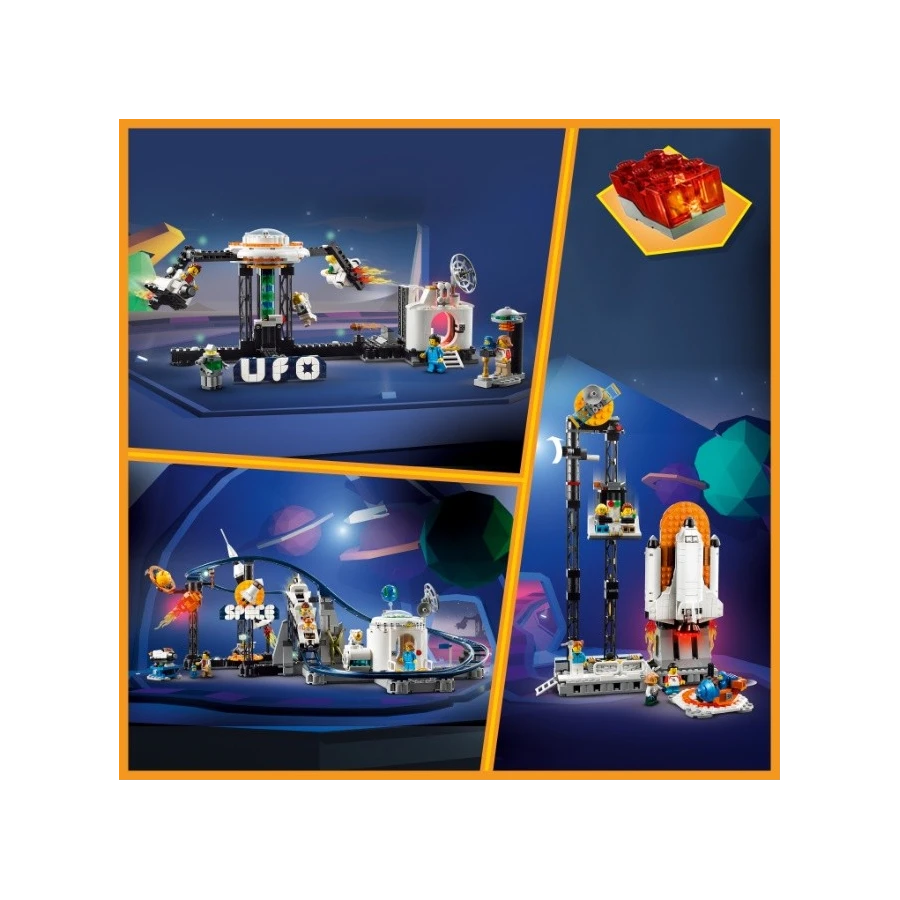 Vydejte se na výlet do zábavního parku s tematikou vesmíru a užijte si úžasné atrakce! Naskočte do vozíku rychlé Vesmírné horské dráhy s asteroidem a meteoritem. Poté model přestavějte na věž s volným pádem a vydejte se vzhůru, abyste pak padali volným pádem k zemi nebo se můžete točit v mini vesmírné raketě nebo raketoplánu na kolotoči. S touto super stavebnicí 3 v 1 je volba jen na vás!