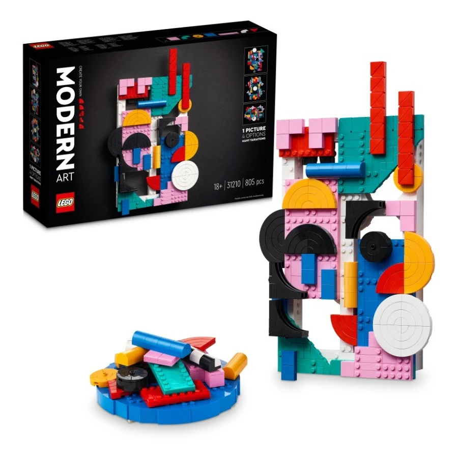 Objevujte svou kreativitu s touto stavebnicí LEGO® (31210) Moderní umění. Vytvořte jedinečné moderní a abstraktní umělecké dílo kombinací barevných a různě tvarovaných prvků včetně obdélníků, trojúhelníků a koleček. Navrhněte si vlastní abstraktní umění Neexistuje špatný způsob tvoření: Stačí experimentovat a bavit se nekonečnými možnostmi. Nemůžete udělat chybu! Přiložený návod na stavění tu není od toho, aby vám říkal, co dělat, ale spíše jako inspirace a návrhy pro vaši uměleckou cestu. Koníčky a tvoření pro dospělé Stavebnice LEGO® Art umožňují dospělým stavitelům vytvořit si vlastní prvotřídní nástěnný obraz, zatímco si užívají poutavý a obohacující stavitelský zážitek. Stavebnice jsou vhodné pro všechny fanoušky hudby, umění nebo filmů. Až budete mít hotovo, vystavte si své dílo na zeď pomocí poutka.