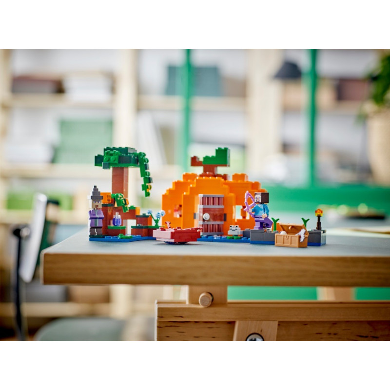 Se stavebnicí LEGO® Minecraft (21248) Dýňová farma se můžou hráči Minecraftu zaměřit na dýně. Tato všestranná sada obsahuje jednu z nejoblíbenějších postav hry a otravnou čarodějnici a inspiruje k nekonečnému akčnímu dobrodružství na dýňovém poli pro děti od 8 let. Tvořivá stavebnice Minecraft s dýněmi Tuto stavebnici z proslulého prostředí bažin lze přestavět různými způsoby a obsahuje hlavní postavu Stevea na dýňové farmě obklopující domek ve tvaru dýně. Dům má vybavený interiér včetně postele, řemeslného stolu, pece a lampy ve tvaru žáby. Venku je dýňové pole, které Steve opečovává motykou. Příležitosti ke hře se však proměňují v bitvu, a to když se objeví čarodějnice, která po Steveovi hází lektvary a on se brání svým lukem. Stavebnice obsahuje také žábu, loďku, spíž s vajíčkem a cukrem, takže si děti mohou upéct dýňový koláč! Stavitelé si také mohou užít porci digitální zábavy navíc pomocí zábavné aplikace LEGO Builder – mohou model přibližovat, otáčet ve 3D a sledovat svůj pokrok.