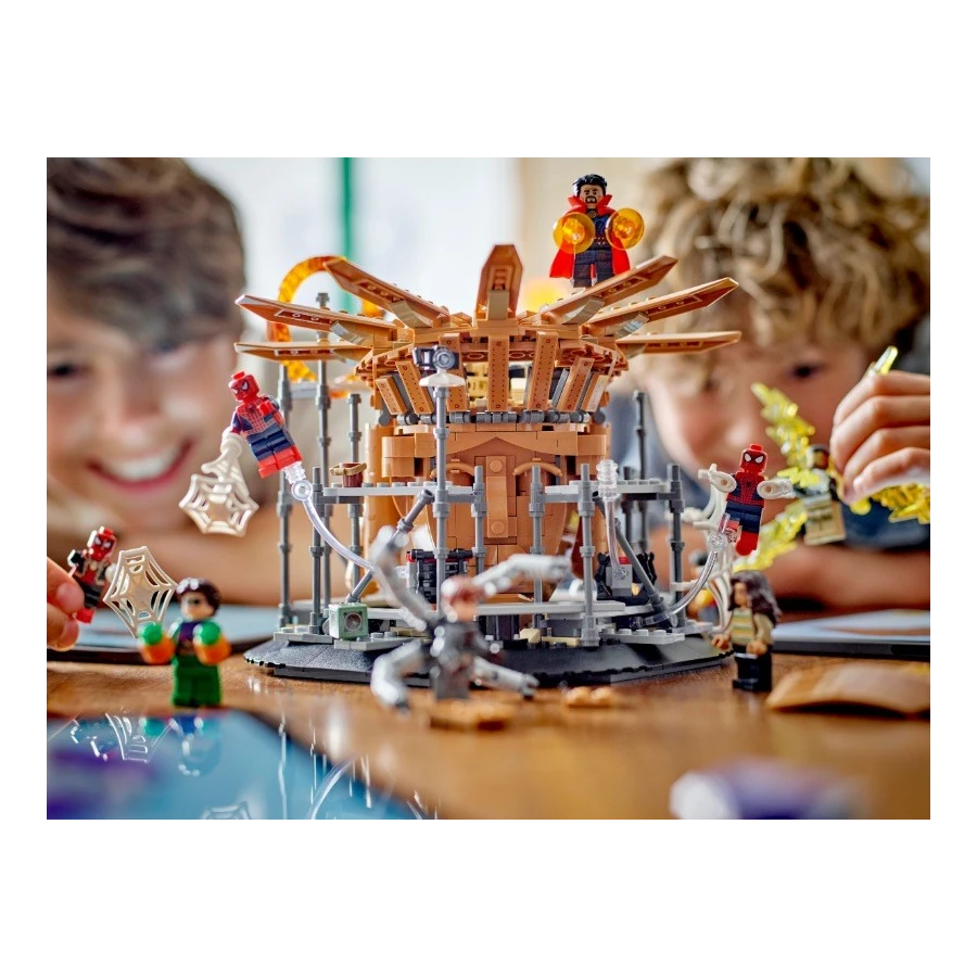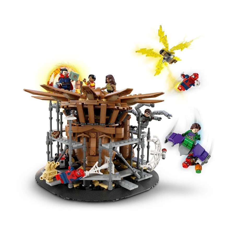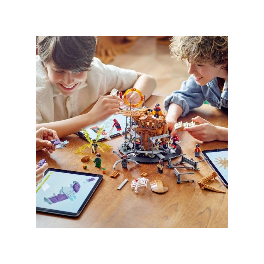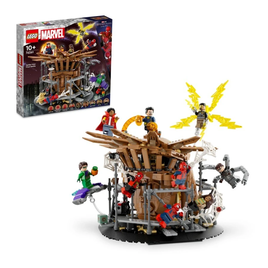 Stavebnice LEGO® Marvel (76261) Spider-Manova konečná bitva znázorňuje senzační rozhodující souboj z filmu Spider-Man: Bez domova od Marvel Studios. Je plná kultovních postav a akce plné pavučin a tato oslava Spidermana nadchne fanoušky od 10 let. 3 světy v 1 sestavitelné hračce Tato 360° stavebnice obsahuje úžasnou kombinaci minifigurek LEGO Marvel včetně 3 verzí Spider-Mana: přátelského Spider-Mana ze sousedství (Tobey Maguire), Úžasného Spider-Mana (Andrew Garfield) a Spider-Mana (Tom Holland). Další minifigurky jsou Electro, Doktor Strange, Zelený goblin, Ned, MJ a Doc Ock. Součástí je mnoho funkcí pro maximální možnosti hraní a vystavení, jako jsou 3 podstavce minifigurek pro akci ve vzduchu, sundávací střecha, která odhalí Sandmanovu ruku, vyklápěcí zadní vstup do portálu a jemnou pavučinu k omotání minifigurek. Stavitelé si také mohou užít porci digitální zábavy navíc pomocí zábavné a intuitivní aplikace LEGO Builder, kde mohou model přibližovat, otáčet ve 3D a sledovat svůj pokrok.