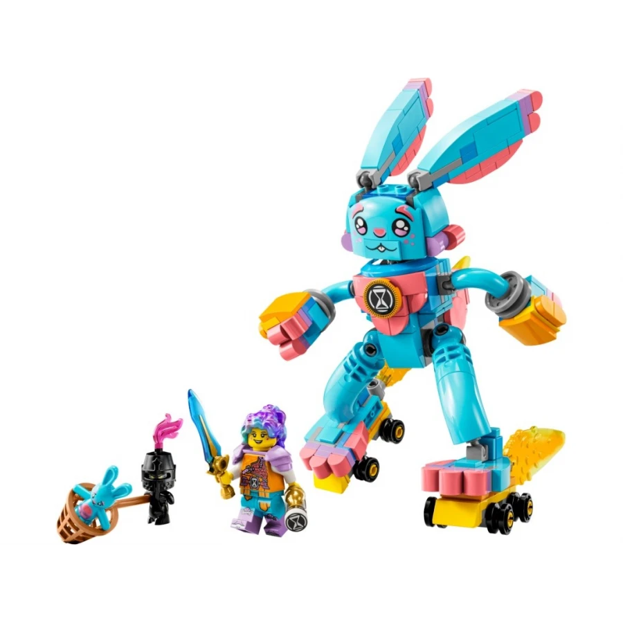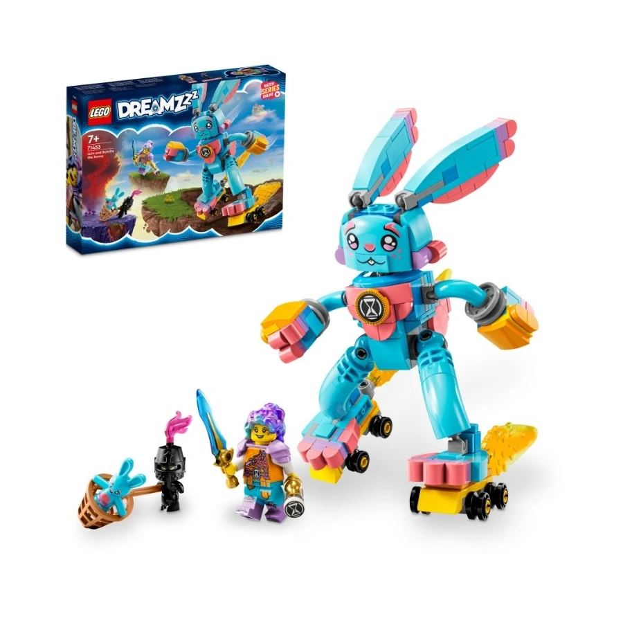 Tato stavebnice LEGO® DREAMZzz™ (71453) Izzie a králík Bunchu vtáhne děti od 7 let přímo do akce ve Světě snů. Podobně jako v napínavém příběhu z tohoto televizního seriálu pomohou děti Izzie stvořit velkou verzi jejího oblíbeného plyšáka a zachránit plyšového králíka, kterého unesl přízračný Škleboun. 1 stavebnice, 2 varianty ke stavění Velká oživlá verze Bunchu má plně pohyblivý krk, ruce a nohy. Při stavění děti využijí vlastní představivost a budou postupovat podle návodu na stavění vedeného příběhem, kde si mohou vybrat, jestli dají králíčkovi kolečkové brusle a rukavice nebo včelí křídla a žihadlo. Fantastická minifigurka Propracovaná minifigurka Izzie podpoří akční hraní. Izzie je vybavená brněním, mečem, přesýpacími hodinami a dalšími doplňky. Součástí jsou také figurky Šklebouna a malého Bunchu, aby si mohly děti přehrát celý příběh.