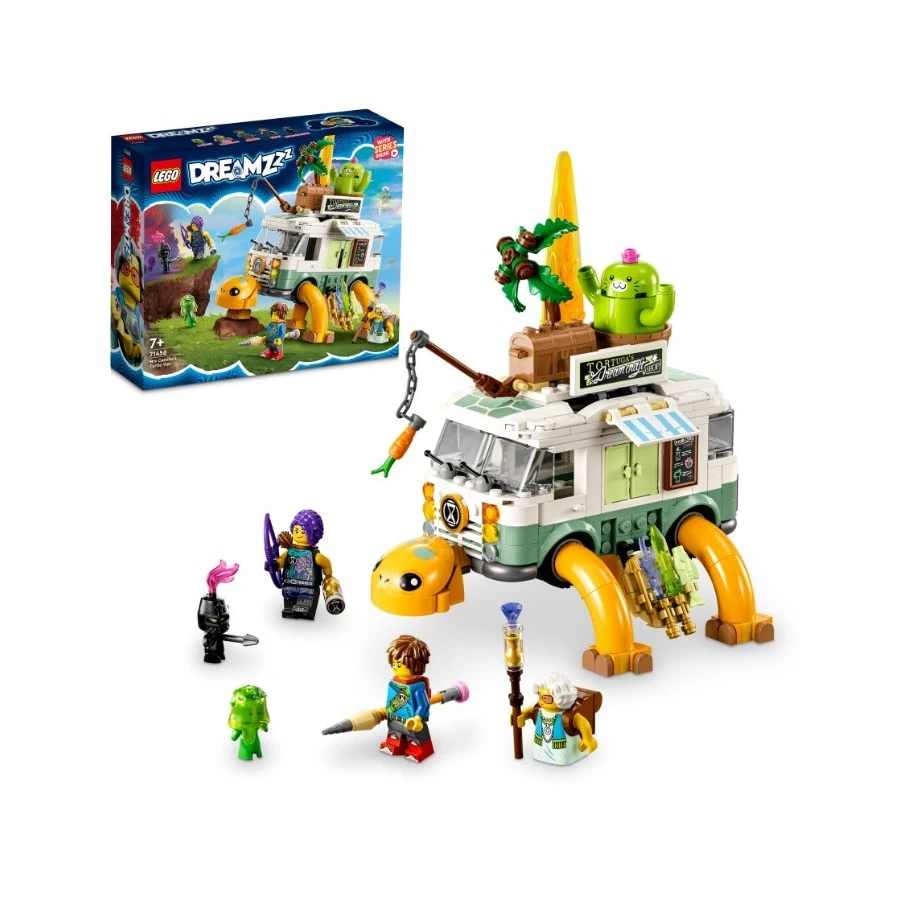 Tato stavebnice LEGO® DREAMZzz™ (71456) Želví dodávka paní Castillové vtáhne děti od 7 let přímo do dobrodružného Světa snů. Je inspirována napínavým televizním seriálem DREAMZzz a dává dětem na výběr ze 2 možností sestavení této parádní dodávky. 1 dodávka, 2 varianty ke stavění V základní podobě má stavebnice Želví dodávka paní Castillové pohyblivá kola a sundávací střechu. Děti ji mohou nekonečně upravovat do 2 různých variant pomocí návodu na stavění vedeného příběhem. Želví dodávku můžete v párty stylu doplnit pohyblivým stromem, otáčecím kaktusem a otevírací truhlou s pokladem. Ve variantě ponorky má želví dodávka jako doplněk raketu a pohyblivý periskop. Varianta ponorky obsahuje také létající verzi Kočičího kaktusu, který cestuje po jejím boku. Tato různorodost podněcuje kreativitu a násobí dobu, kterou si děti užijí při stavění každé z variant. Fantastické minifigurky • Stavebnice obsahuje minifigurky paní Castillové, Matea a Zoey a všechny můžete usadit do dodávky.