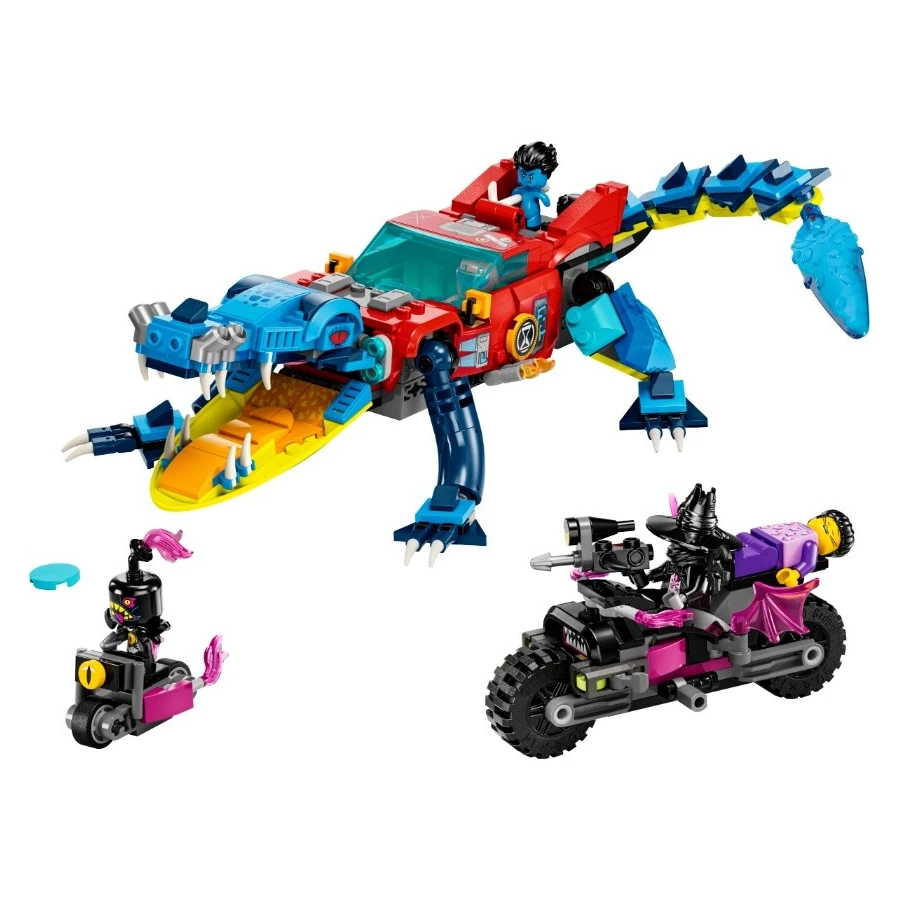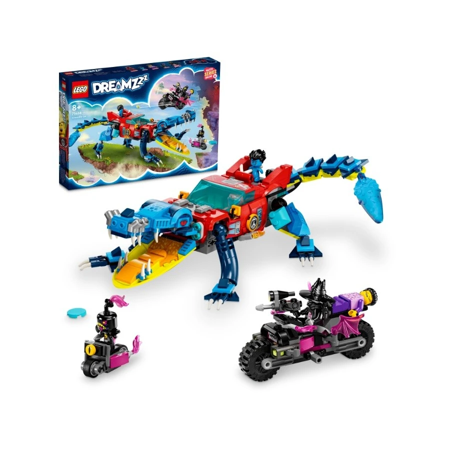 Děti od 8 let se s touto sadou LEGO® DREAMZzz™ (71458) Krokodýlí auto vydají do Světa snů. V duchu televizního seriálu tu děti vytvoří parádní auto, které pomůže zachránit Jaydena před děsivým Nočním lovcem. 1 stavebnice, 2 varianty ke stavění Herní stavebnice obsahuje 2 varianty ke stavění a mnoho návodů vedených příběhem, které dětem dávají možnost zvolit si své dobrodružství a užít si dvojnásobnou dobu hraní. Mají na výběr mezi sestavením krokodýlího auta k boji proti nočním můrám a super rychlým terénním autem a mini loďkou k jejich pronásledování. V krokodýlí verzi má auto pohyblivé ruce a nohy a v přední mřížce je ukrytý vystřelovač disků, kterým děti vystřelují disky z krokodýlí tlamy. Terénní auto má otáčecí kola a sundávací střechu, abyste dovnitř mohli posadit minifigurku. Fantastické minifigurky Stavebnice obsahuje propracované minifigurky Coopera a Jaydena a navíc Nočního lovce, který je vybavený parádní motorkou a zlým pomocníkem.