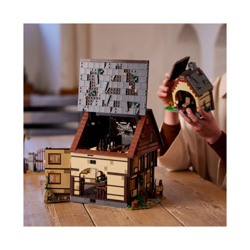 • Zábavné funkce – Otáčejte vodním kolem a z komínu bude stoupat růžový „dým“, aktivujte světelnou kostku LEGO® a zapalte tak oheň pod kotlíkem, otevřete čarodějnickou Knihu kouzel a mnoho dalšího