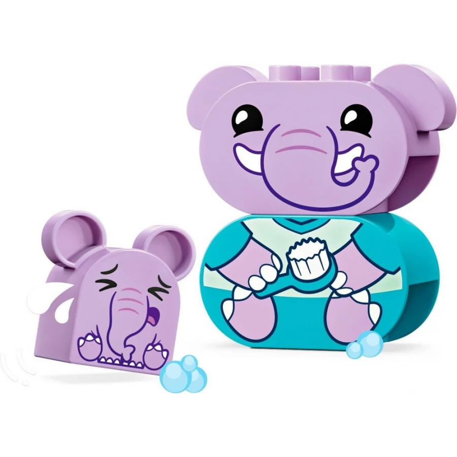 Zábavná stavebnice LEGO® DUPLO® Moje první každodenní aktivity: Koupání malým dětem pomůže porozumět svým pocitům. Navíc rodičům usnadní povídání si s dětmi o používání toalety a o každodenním koupání. Součástí sady je vana, sprcha a záchod a 2 figurky přátelských slonů – dospělého slona a slůněte. Figurka malého sloníka má 2 výrazy a malé děti vám tak názorně ukážou, jaké pocity mají z jednotlivých činností!