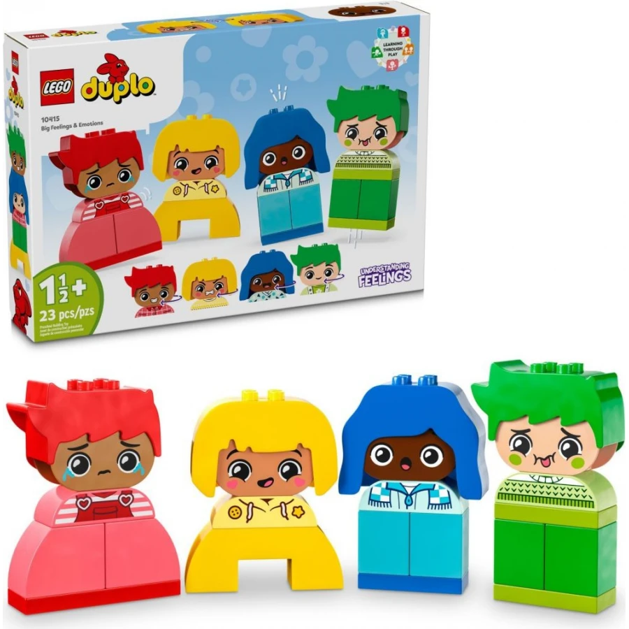 Kreativní stavebnice LEGO® DUPLO® Moje první pocity a emoce dětem přináší způsob, jak při zábavném hraní vyjádřit svou osobnost. Sada pro malé stavitele pomáhá rozvíjet sebeuvědomění. Každá ze 4 postaviček má 2 výrazy – veselý a nepříznivý – a dospělí a batolata si s jejich pomocí vysvětlí pocity.