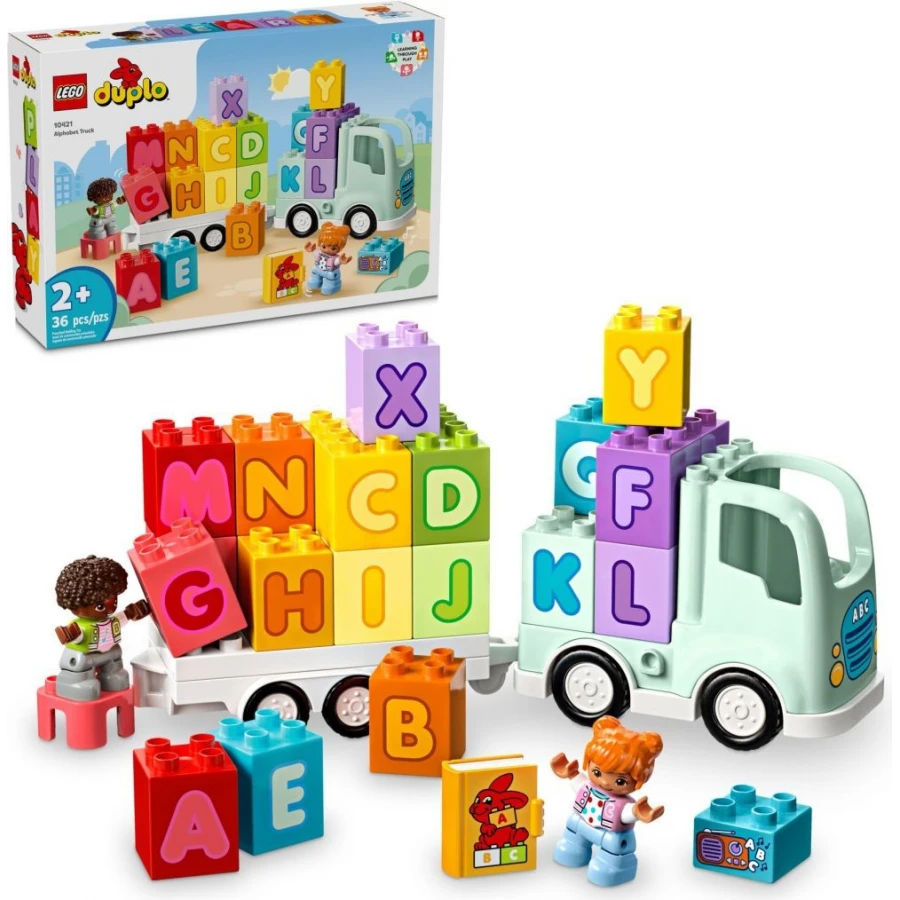 • Stavebnice pro batolata – Součástí je pojízdný náklaďák s odpojitelným přívěsem, 2 figurky LEGO® DUPLO® a 26 kostek s písmenky