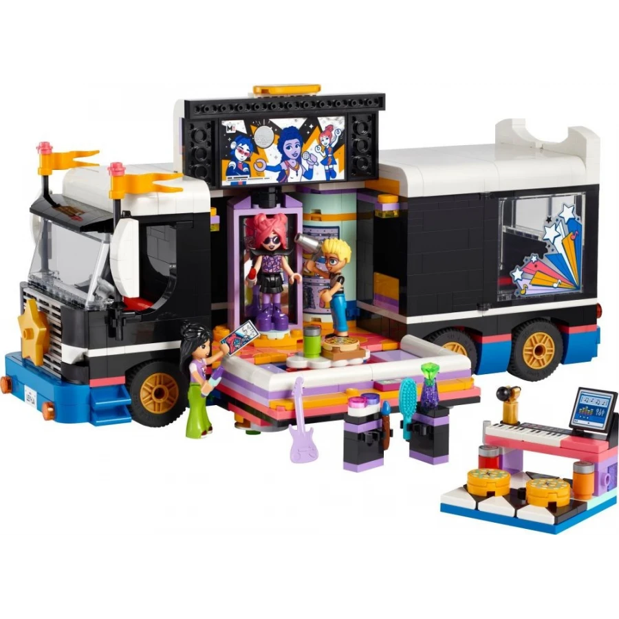 Vdechněte život stavebnici LEGO® Friends (42619) Autobus pro turné popových hvězd pro děti od 8 let. Součástí stavebnice je sestavitelný model autobusu a zákulisí s doplňky a 4 postavami LEGO Friends. S touto stavebnicí se děti pustí do vyprávění o tom, jak se stydlivá Paisley před zrcadlem přemění ve hvězdnou umělkyni Ley-Lu. Malí stavitelé si vymyslí příběhy o přátelství, ve kterých Olly zpěvačce pomůže vytvořit outfit na vystoupení a Liann přijde navštívit svou oblíbenou hvězdu Ley-Lu. Autobus lze otevřít zepředu, zezadu i po stranách a odhalit tak propracovaný interiér včetně zákulisí s nahrávacím prostorem, klávesami, kytarou, postelemi a koupelnou. Ve stavebnici nechybí řada doplňků, včetně fotografie s autogramem, ramenních vycpávek, bot, make-upu a telefonu. Stavebnice představuje zábavný dárek pro děti, které milují hudbu nebo vyprávění a zároveň pomáhá rozvíjet sociální a emoční dovednosti.