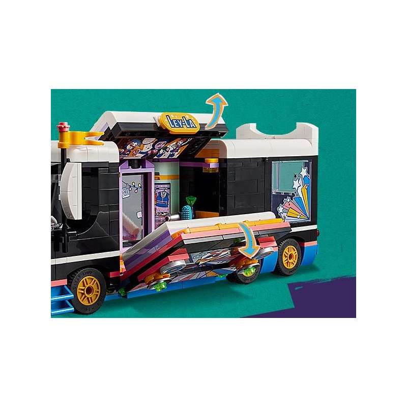 Uhodnete, kdo je ve skutečnosti popová hvězda Ley-La? Správně, je to Paisley! A teď se můžete přidat na její LEGO® Friends Autobus pro turné popových hvězd. Otočte zrcadlo a proměňte Paisley v Ley-Lu. Mezi představeními Paisley odpočívá v zákulisí, kde se nachází i nahrávací studio, postele a koupelna. Liann přišla Ley-Lu požádat o autogram. Uvědomí si, že je to vlastně její kamarádka Paisley?