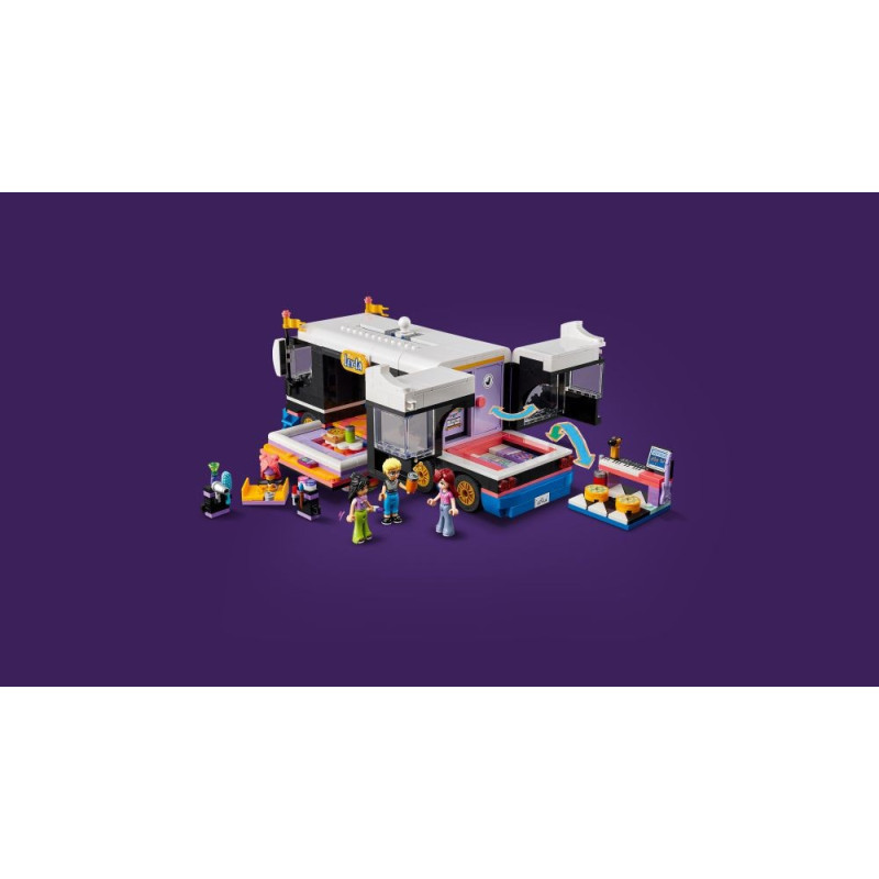 • Nalaďte se na hudbu s autobusem pro turné – Součástí stavebnice LEGO® Friends Autobus pro turné popových hvězd pro děti od 8 let jsou 4 minipanenky a spousta doplňků
