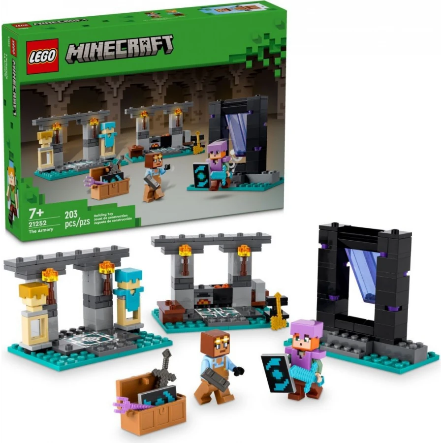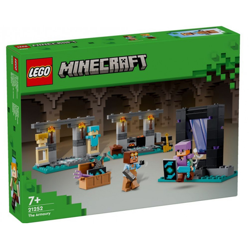 Milovníci hry Minecraft® od 7 let si oblíbí akční stavebnici Zbrojnice (21252). Představuje skvělý dárek pro děti a je ideálním úvodem do kreativního světa dobrodružných stavebnic LEGO® Minecraft. Součástí této stavebnice na motivy videohry Minecraft jsou 2 oblíbené postavy: akční hrdinka Alex se štítem a diamantovým mečem a pracovitý kovář brnění. Sada se skládá ze 3 částí: Z kovárny s kovadlinou, pecí, brusným kamenem a kotlíkem s lávou, ze zbrojnice s truhlou se zlatou sekerou, začarovaným trojzubcem, netheritovým mečem, štítem a dalšími prvky ze světa Minecraft a z portálu do Netheru s dveřmi, které malé stavitele dovedou k dalšímu dobrodružství. Děti mohou tuto dobrodružnou stavebnici propojit s dalšími sadami z řady LEGO Minecraft, například Přepadení v portálu do Netheru (21255), která se prodává samostatně, a užít si ještě větší porci zábavy.