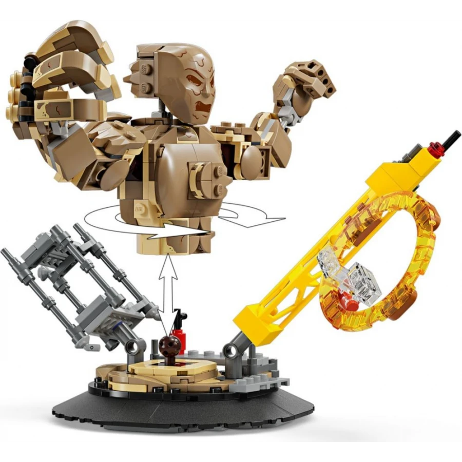 • Parádní bitevní model z kostek LEGO® – Malí fandové filmů od Marvelu mohou otáčet plně pohyblivý model Sandmana a chytat do jeho obřích rukou Spider-Mana, který se nad ním vznáší na svém pavučinovém „laně“