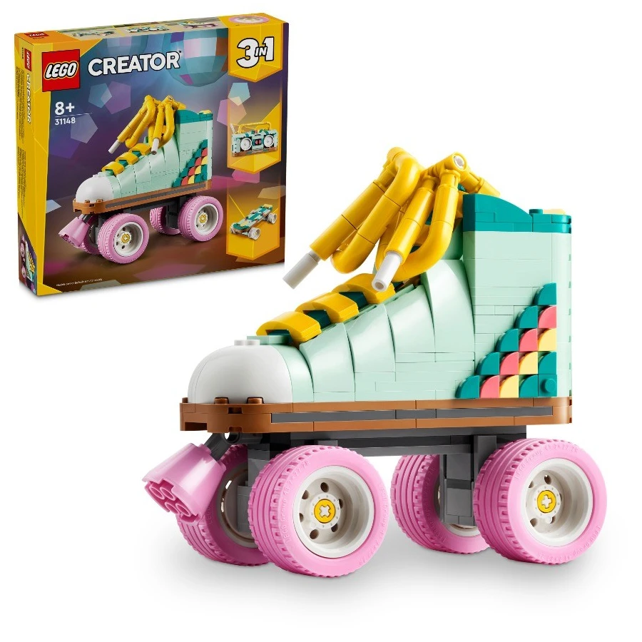Kreativní děti od 8 let se se stavebnicí LEGO® Creator 3 v 1 (31148) Retro kolečkové brusle vrátí do minulosti. Postaví si s ní kolečkovou brusli LEGO se 4 pohyblivými růžovými kolečky, růžovou brzdou, tlustou žlutou tkaničkou a sadou barevných dílků, se kterými ozdobí patu brusle podle vlastní fantazie. S touto stavebnicí LEGO® Creator 3 v 1 si děti postaví hned 3 různé modely ze stejné sady kostek a vychutnají si stavitelský a herní zážitek. Postaví si model kolečkové brusle, který pak přeskládají na miniaturní retro skateboard nebo na retro kazeťák s krátkou anténou. Všechny 3 modely představují poutavé výstavní kousky, které si děti po hraní hrdě vystaví v pokojíčku. Stavebnice LEGO Creator 3 v 1 představují skvělé dárky pro děti. Malí stavitelé v každé krabici najdou dílky k sestavení a přestavování 3 různých modelů. Se stavebnicemi 3 v 1 je čekají hodiny zábavy a postaví si s nimi modely inspirované jejich zájmy, včetně superrychlých vozidel, úžasných zvířat a propracovaných městských scén.
