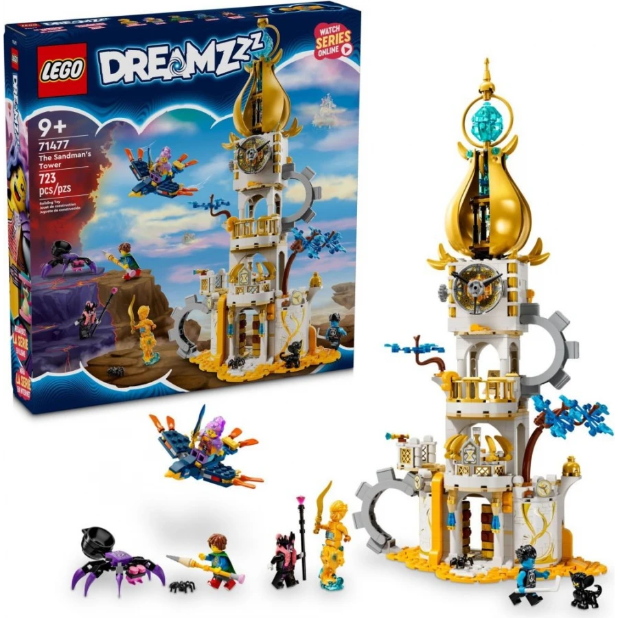 Děti od 9 let si přímo zamilují prozkoumávání stavebnice LEGO® DREAMZzz™ (71477) Sandmanova věž, která je inspirovaná strhujícím seriálem. Malí stavitelé pomůžou figurkám hrdinů bránit Sandmanův kouzelný domov před zlou Nikdyčarodějnicí a jejím poskokem Sneakem!Tato fantasy stavebnice zažehne jiskru dětské představivosti a malí stavitelé se můžou těšit hned na 2 varianty stavění. Vyberou si, jestli postaví impozantní pevnost s dělem s přesýpacími hodinami, nebo elegantní věž s otáčecí horní částí. Součástí obou variant je řada doplňků, jako například stojan se zbraněmi, lektvary a kniha kouzel, a fantastické zvířecí figurky, jako je pavouk a pohyblivá figurka ptáčka.Izzie, Mateo, Logan, Sandman, zlá Nikdyčarodějnice a figurka Sneaka vdechují život stavebnici zámku a děti si z ní postaví vlastní snovou věž.