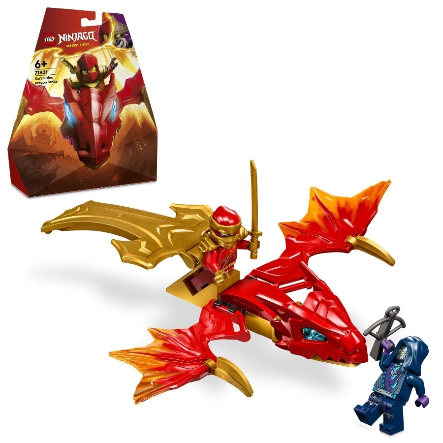 Děti od 6 let se stavebnicí Kai a útok draka (71801) z kostek LEGO® znovu prožijí dobrodružství z 2. řady televizního seriálu NINJAGO® Dračí povstání. Malí stavitelé si tuto akční hračku draka LEGO NINJAGO , první svého druhu, přímo zamilují – sklopí zlatý ocas draka a budou sledovat, jak se pouští do akce. Součástí stavebnice jsou 2 minifigurky: Drak Kaie s katanou a schopností jezdit na hřbetu sestavitelné akční figurky draka a stráž s vlčí maskou se samostřílem. Malí nindžové si budou přehrávat bitvy mezi postavami ze světa LEGO NINJAGO a získají modrý dílek dračí síly, který se ukrývá v otevírací tlamě akční figurky draka. V dalších fantastických stavebnicích z řady LEGO NINJAGO (prodávají se samostatně) se sestavitelnými hračkami s nindžovskou tematikou najdete robotické obleky, vozidla a chrámy a děti si užijí hodiny zábavného hraní se svými oblíbenými hrdiny. Aplikace LEGO Builder vám a vašemu dítěti ukáže snadnou a intuitivní cestu stavitelským dobrodružstvím.