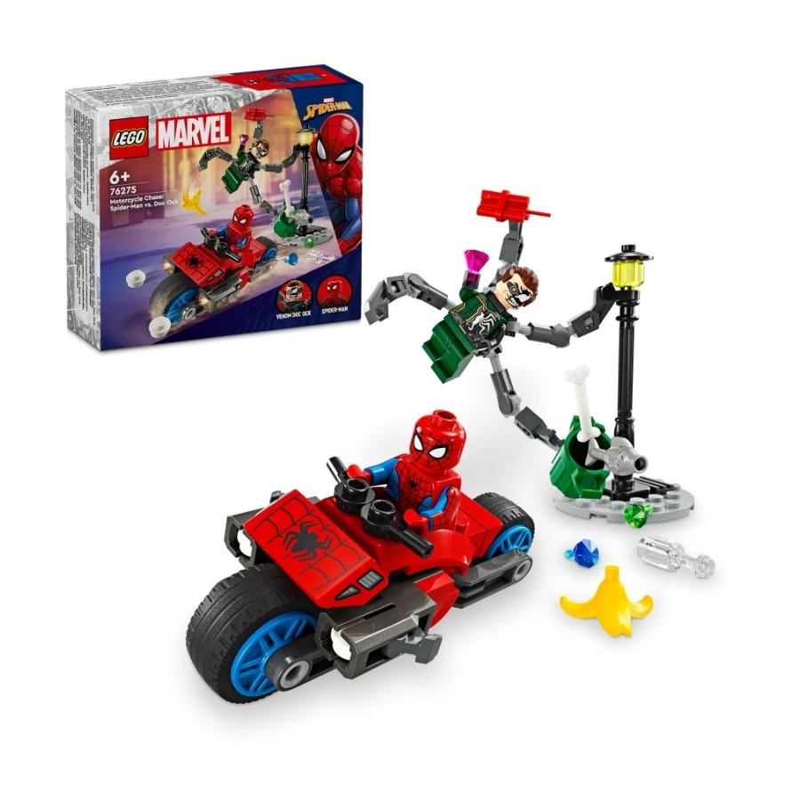 • Spider-Man vs. Doc Ock – Součástí je sestavitelná Spider-Manova motorka se 2 vystřelovači a 2 minifigurky – Spider-Man se 2 vystřelovači pavučin a Doc Ock se 4 dlouhými, pohyblivými chapadly