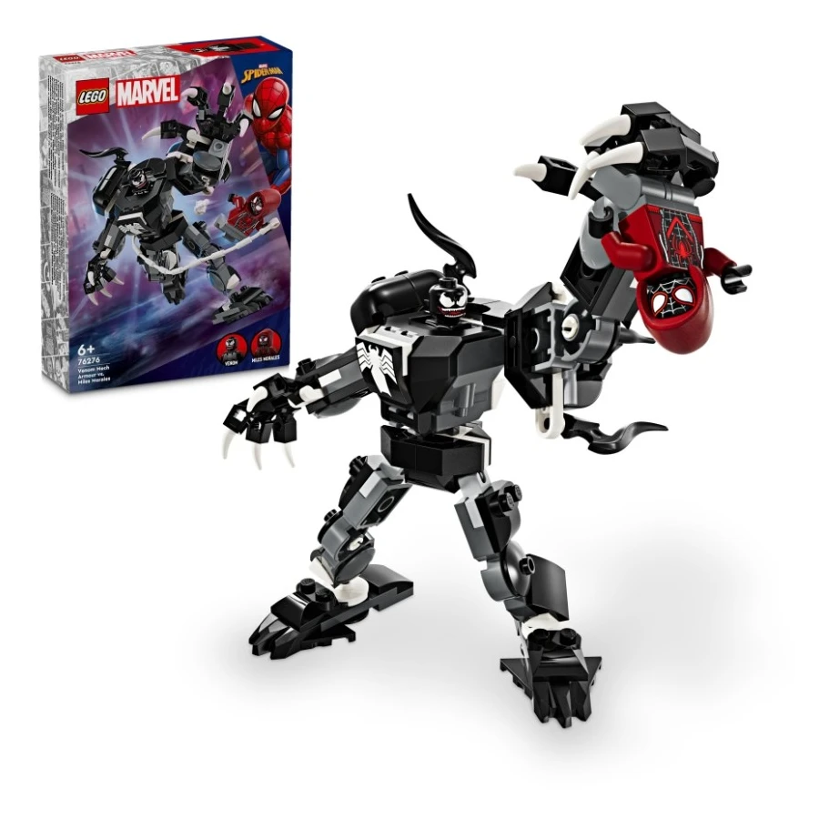 Se stavebnicí LEGO® Marvel (76276) Venom v robotickém brnění vs. Miles Morales se malí stavitelé od 6 let pustí do velkolepých dobrodružství se svými oblíbenými superhrdiny. Užijí si velkou porci zábavy s houpáním na pavučinách, superhrdiny a sestavitelným robotickým brněním Venoma s klouby, 2 minifigurkami oblíbených postav a doplňky vystřelujícími pavučiny. Sestavitelné robotické brnění Venoma má spoustu funkcí, včetně plně pohyblivých paží, nohou a rukou s drápy, které jsou dostatečně velké na to, aby uchopily minifigurku. Otevřete hrudník brnění a odhalte kokpit pro minifigurku Venoma. Nechybí ani minifigurka Milese Moralese se 2 ručními vystřelovači pavučin a ohebným pavučinovým „lanem“, které lze hned na několika místech připevnit k robotickému brnění Venoma. Děti mohou tuto stavebnici kombinovat s dalšími robotickými brněními z řady LEGO Marvel (prodávají se samostatně) a rozšířit nápadité herní možnosti. Pro ještě více digitální zábavy je zde zábavná a intuitivní aplikace LEGO Builder, kde mohou stavitelé přibližovat a otáčet modely ve 3D a sledovat postup.